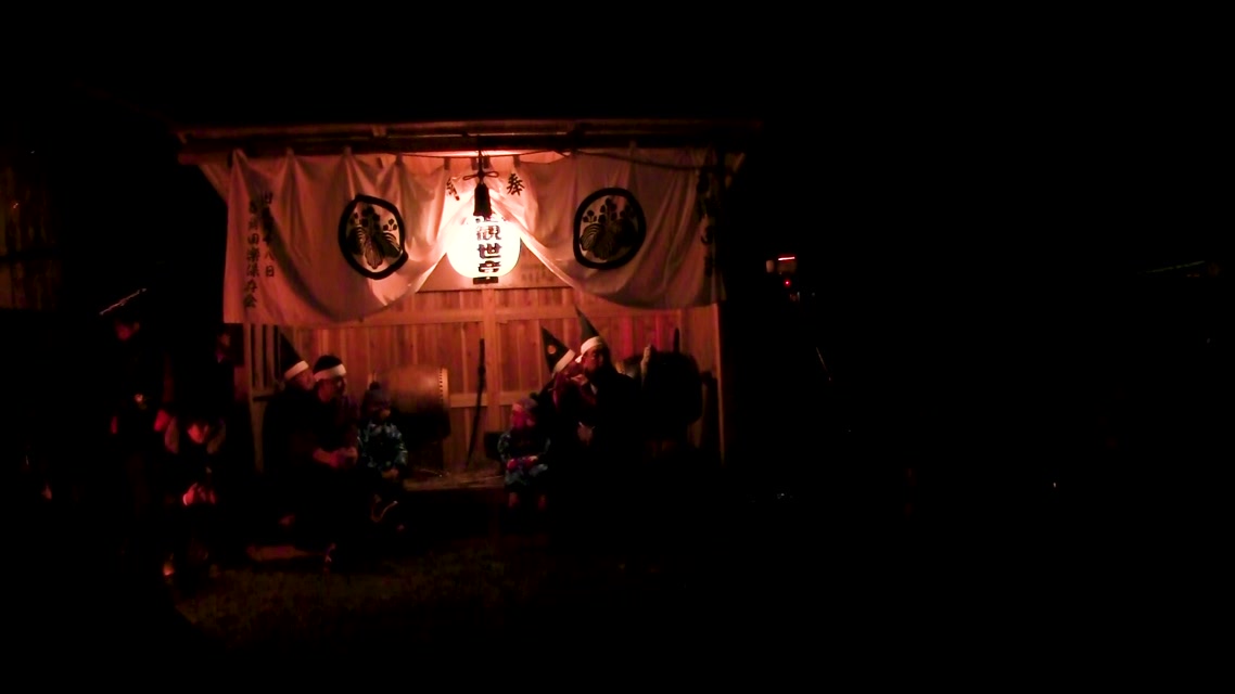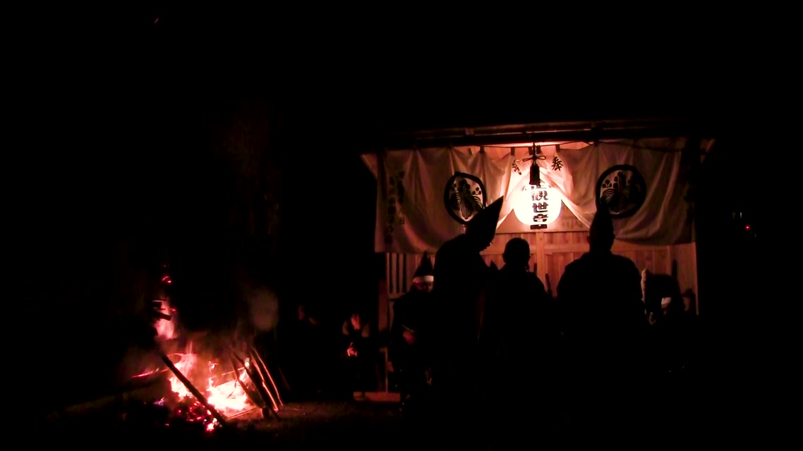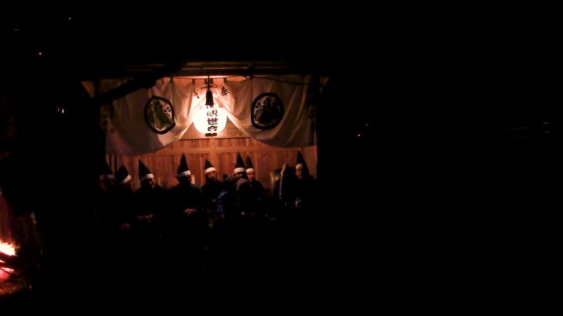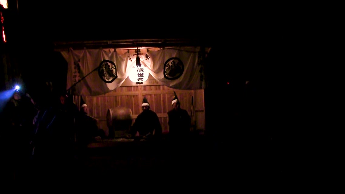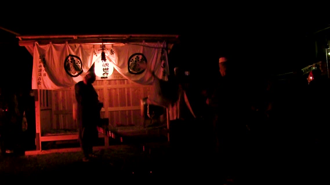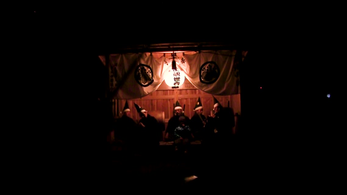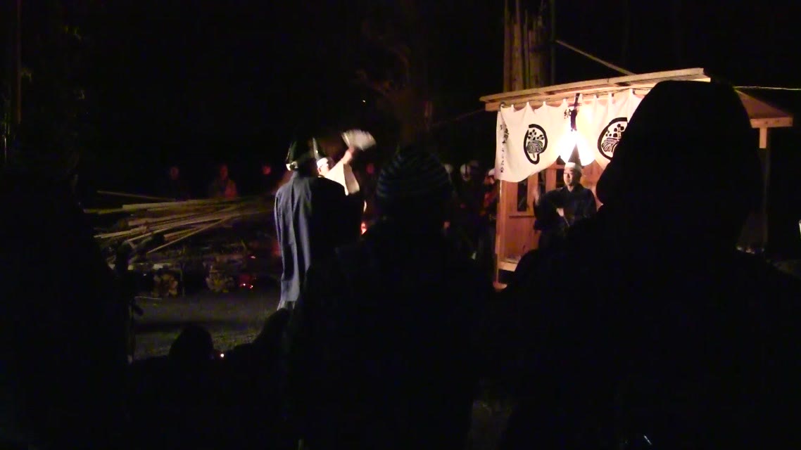 内陣の火を灯した御舟を、能衆全員で引いて「池島タイ」に灯し、観音様をタイにお連れする。