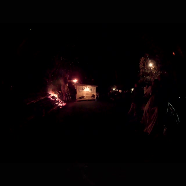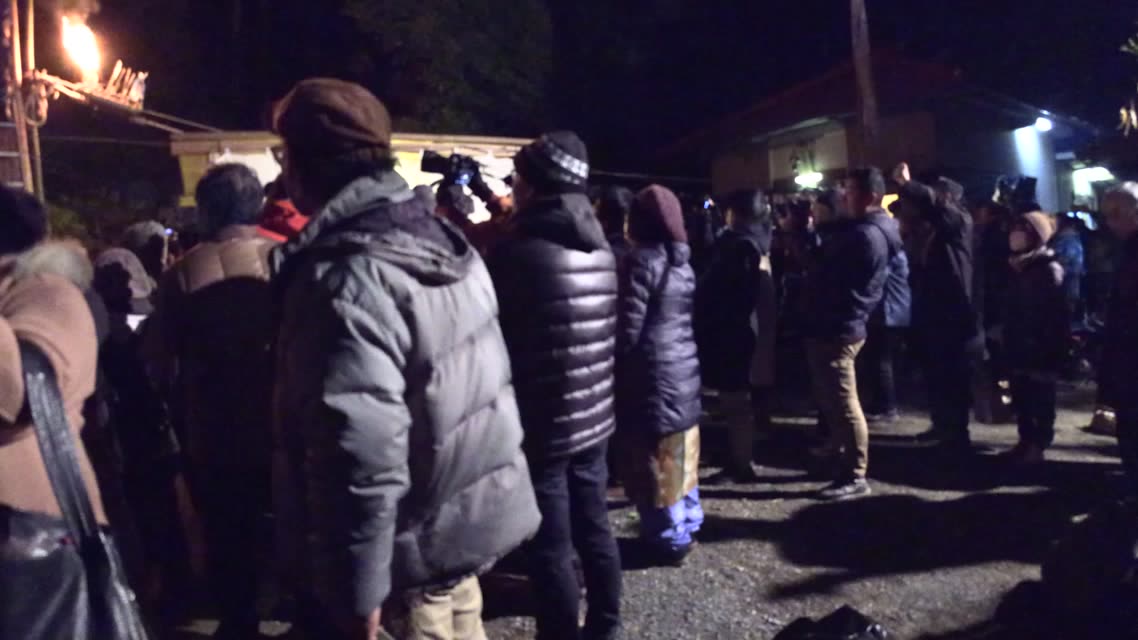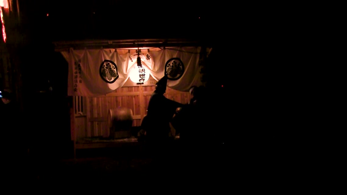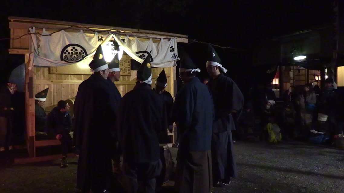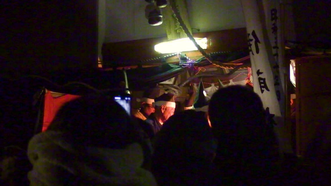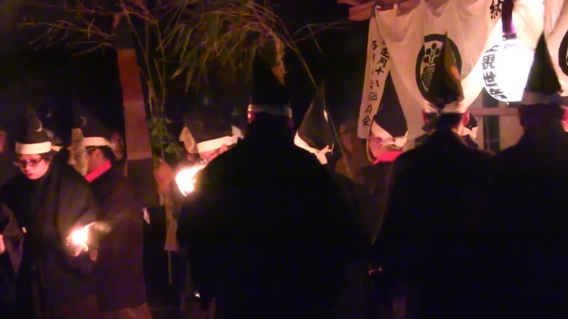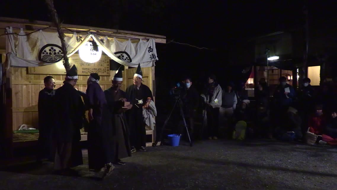 内陣の火を灯した御舟を、能衆全員で引いて「池島タイ」に灯し、観音様をタイにお連れする。