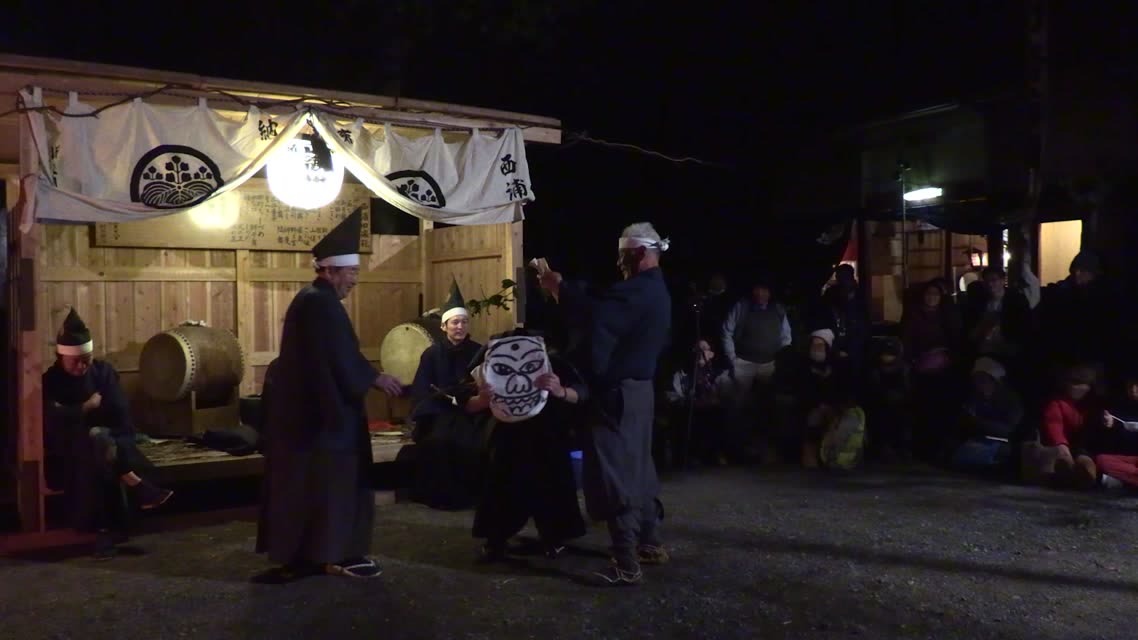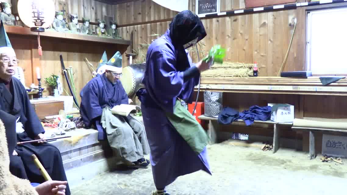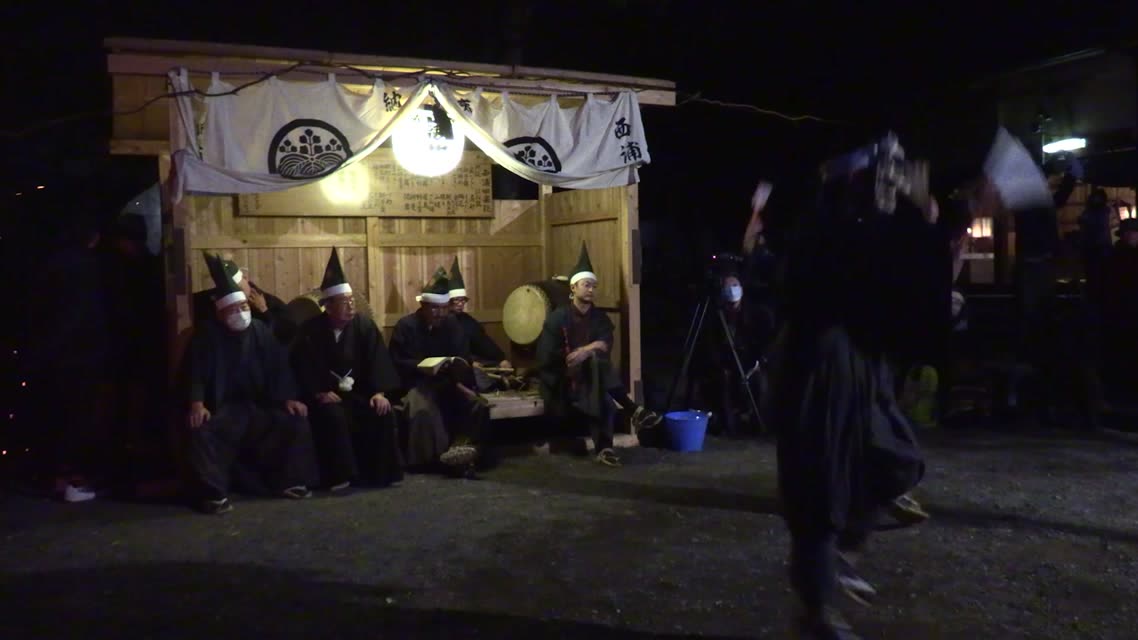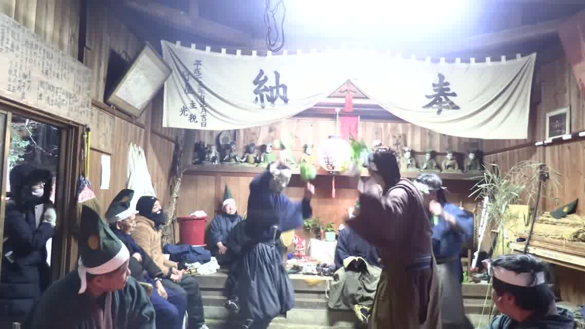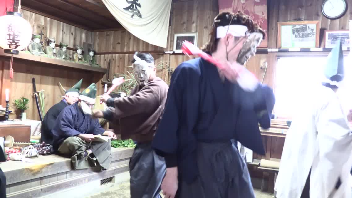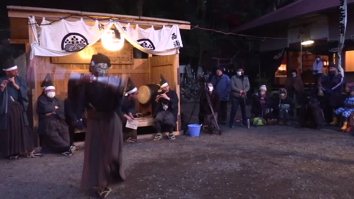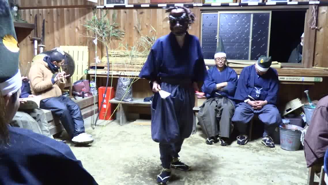 能楽の「田村」の謡にあわせて、しんたい面と2人の鬼面が舞う。