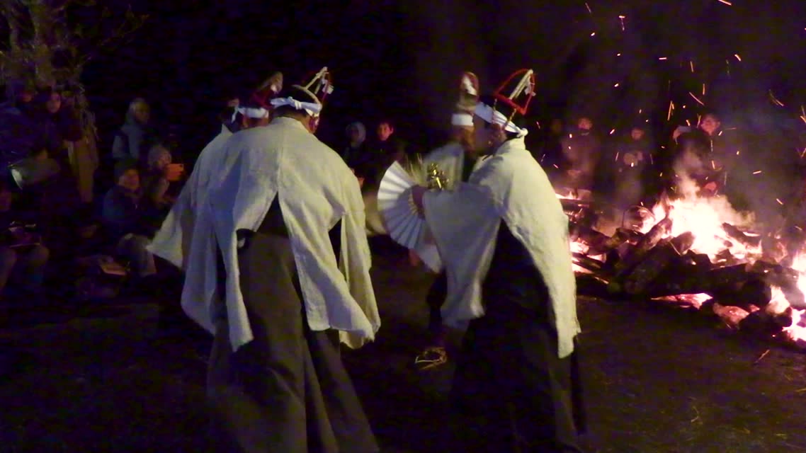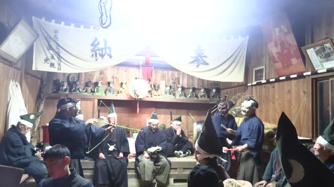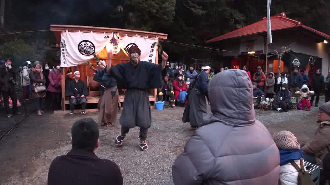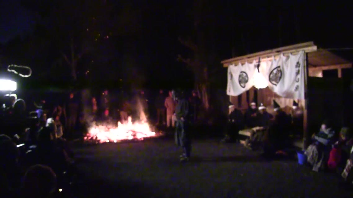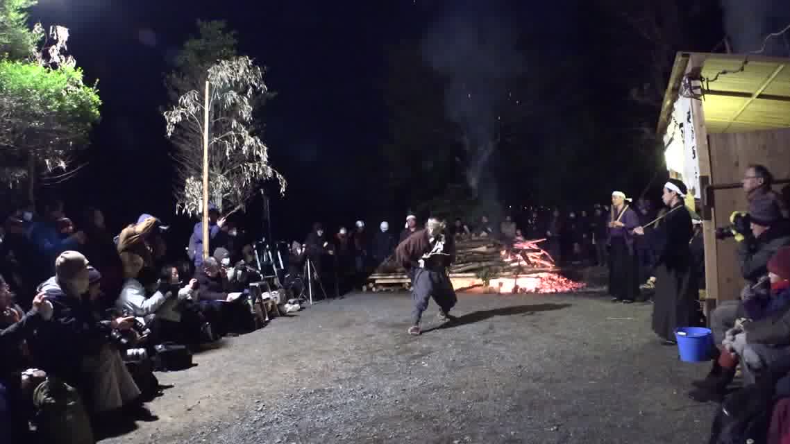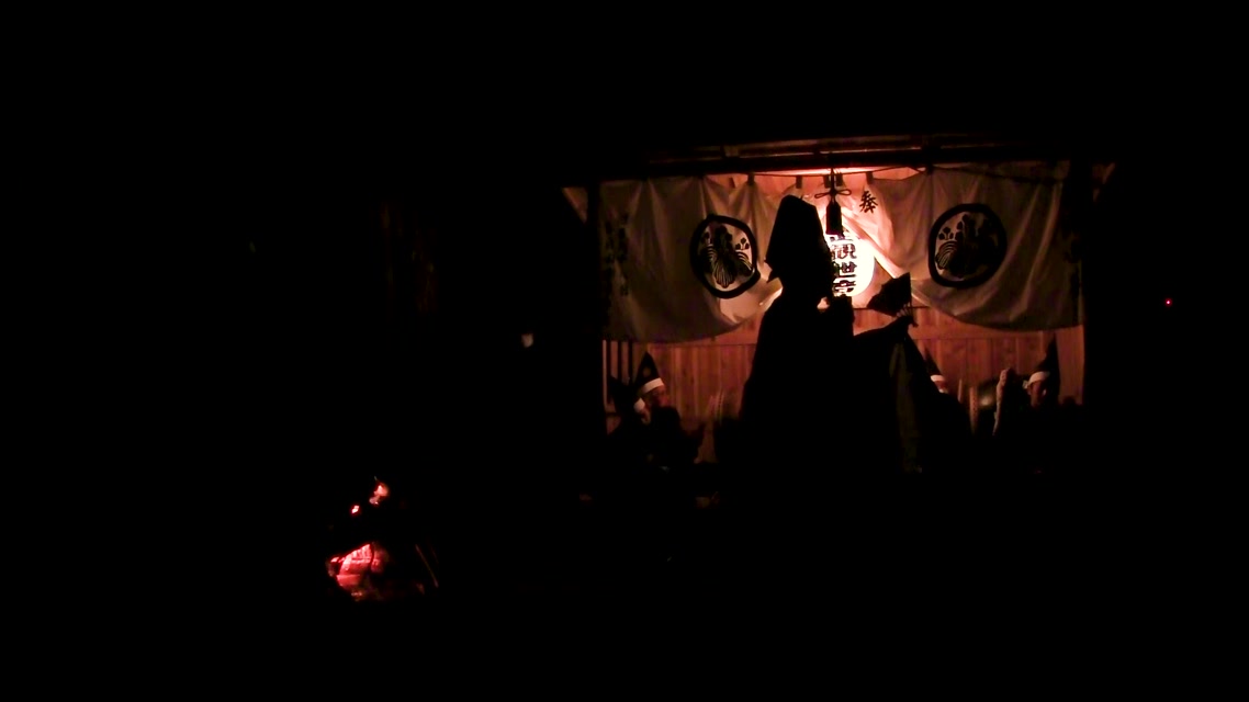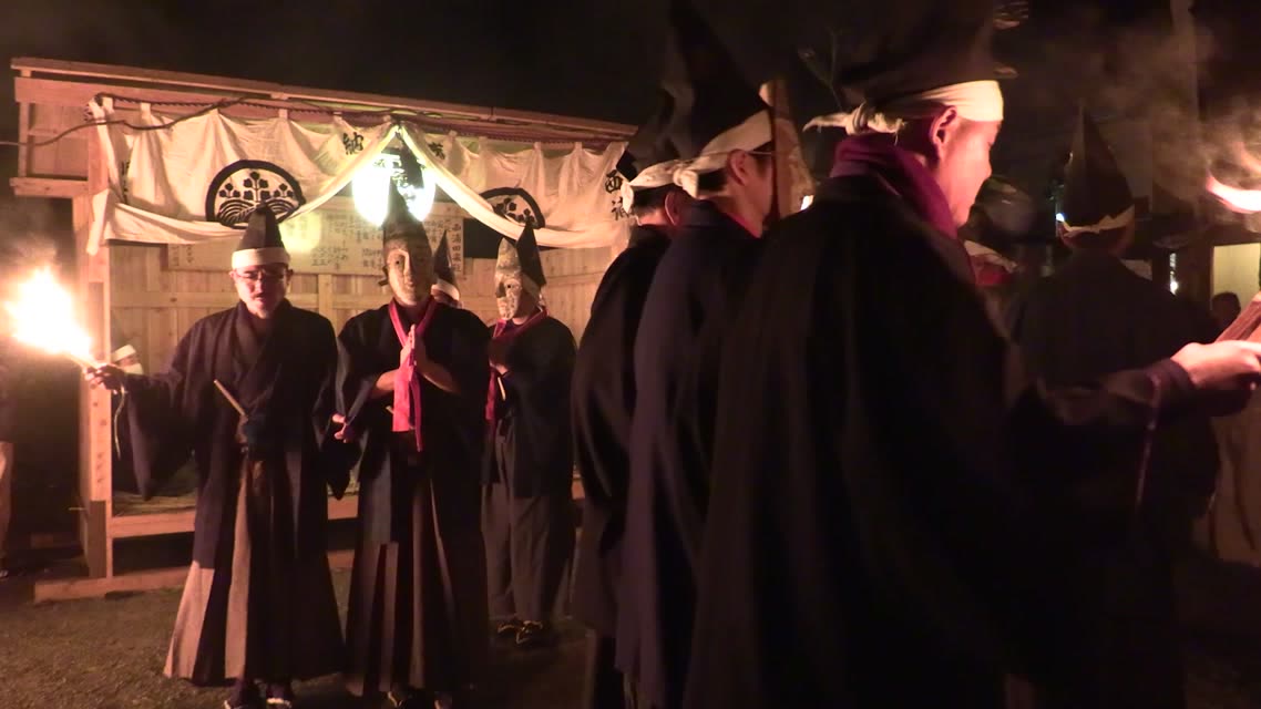 能楽の「田村」の謡にあわせて、しんたい面と2人の鬼面が舞う。