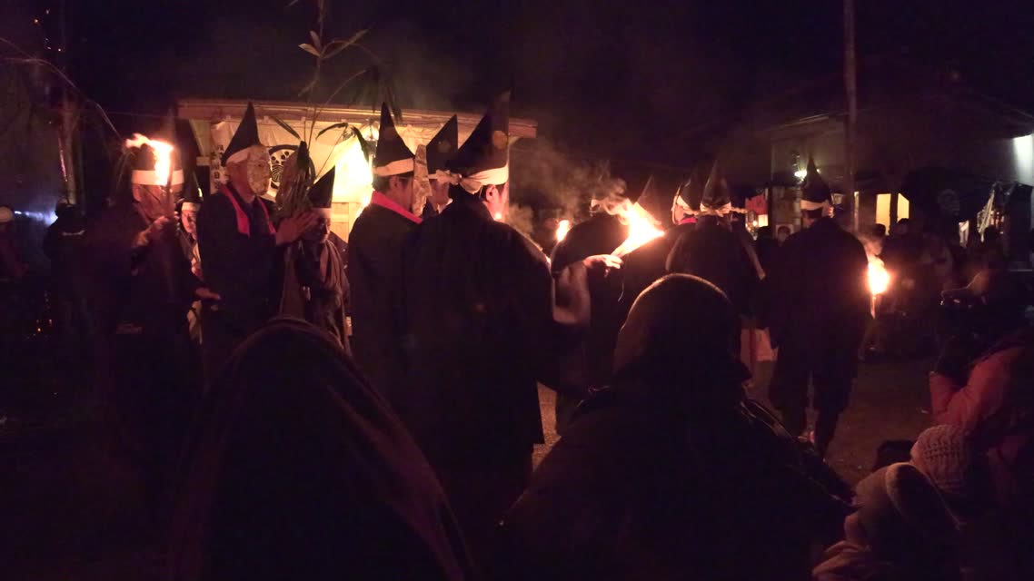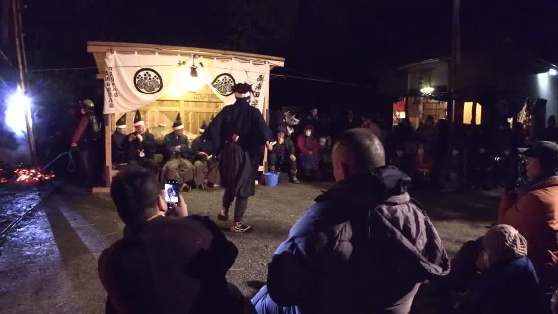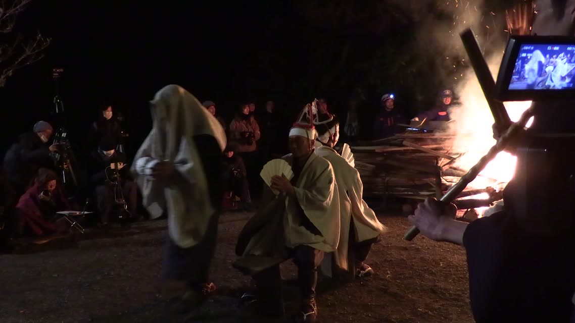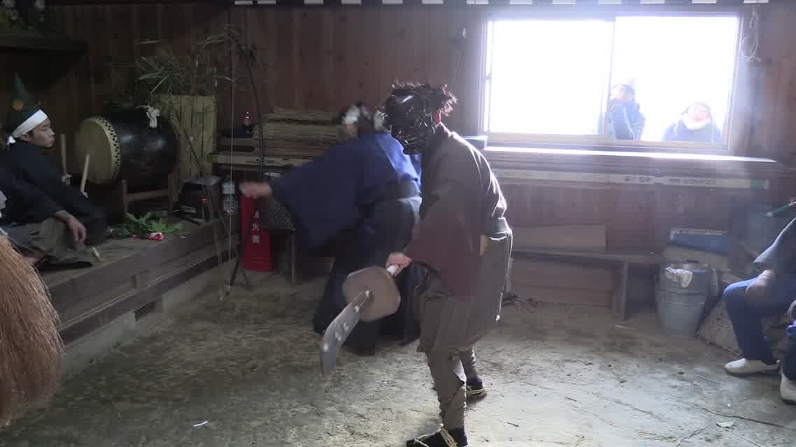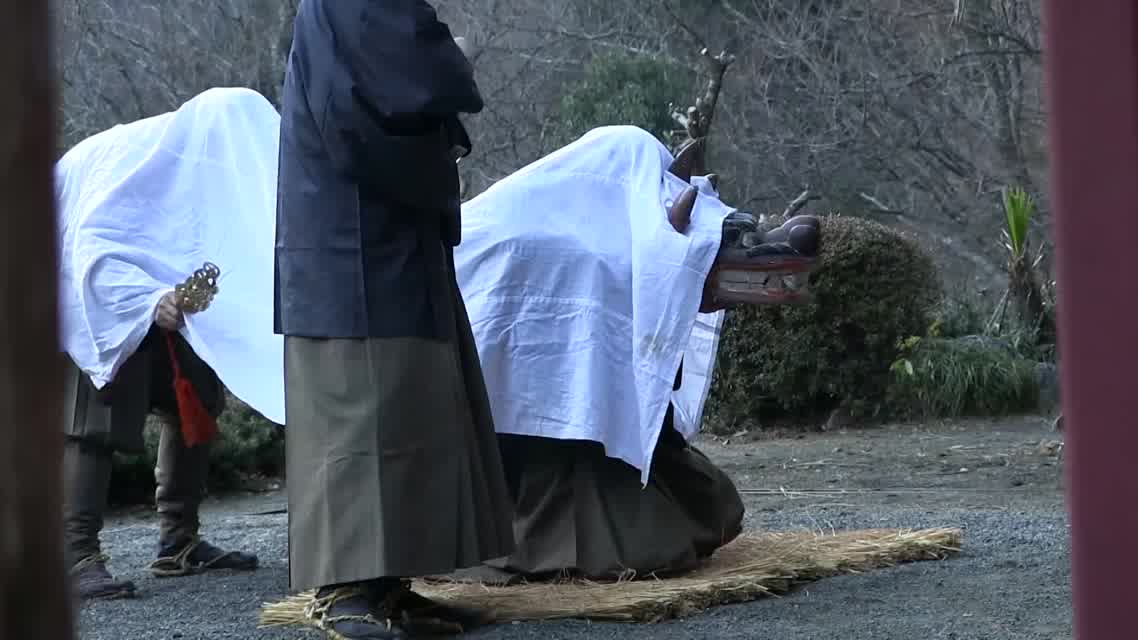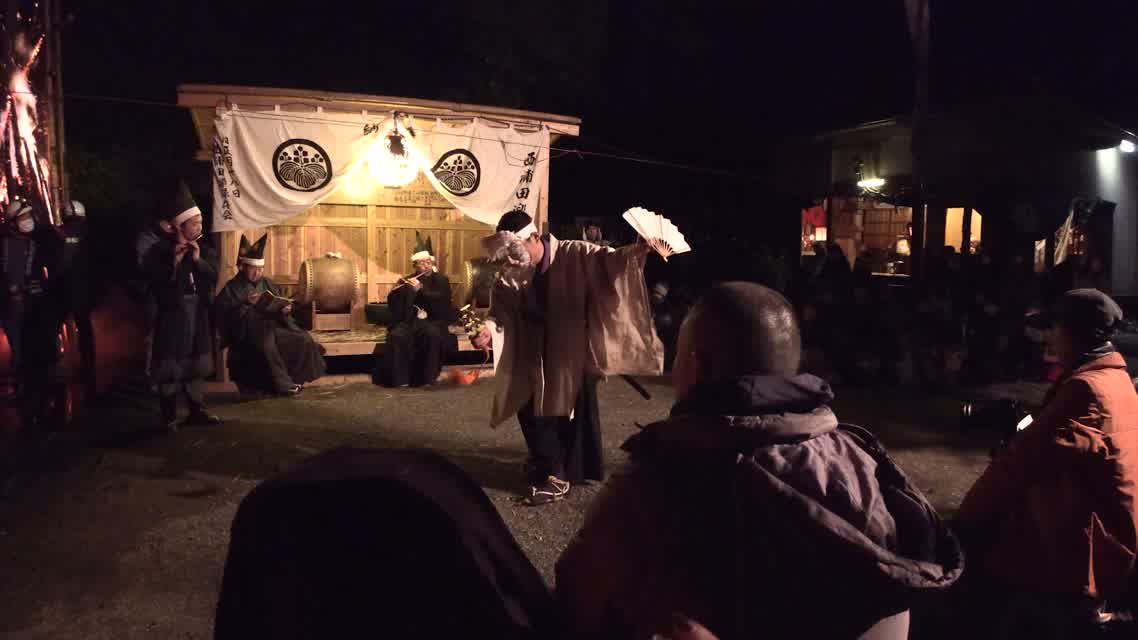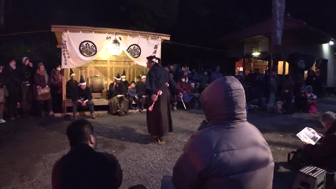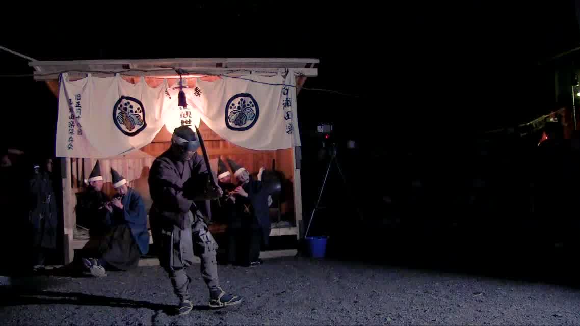 能楽の「田村」の謡にあわせて、しんたい面と2人の鬼面が舞う。