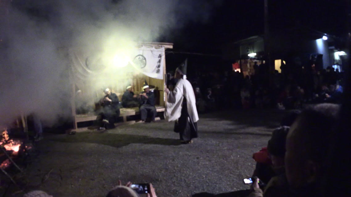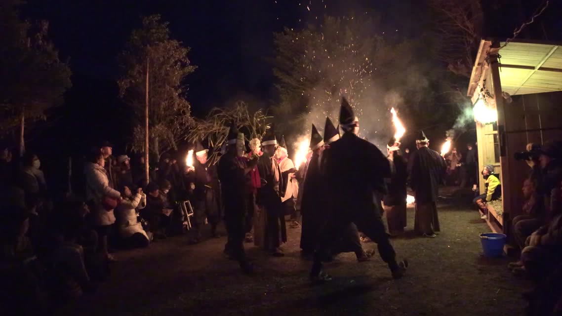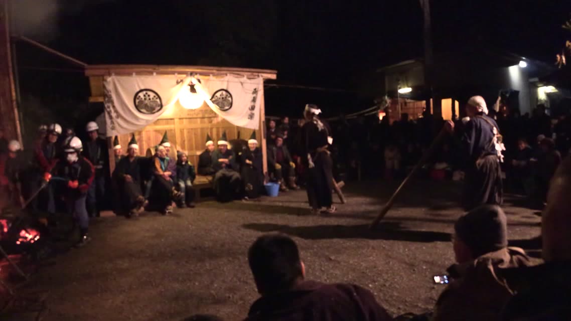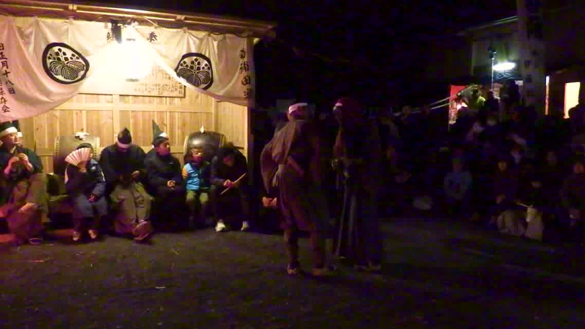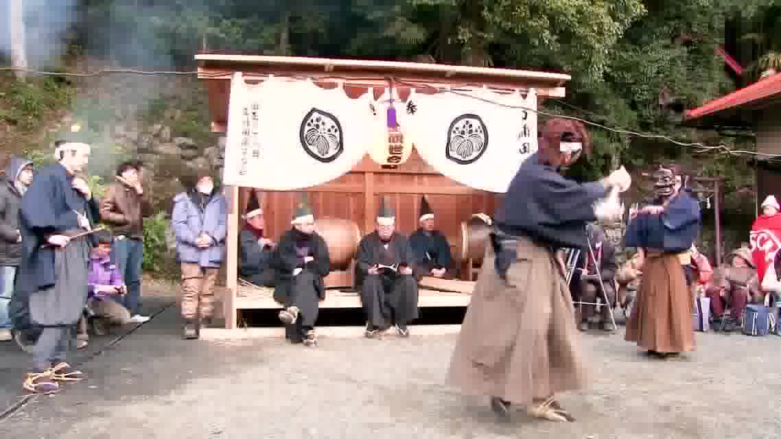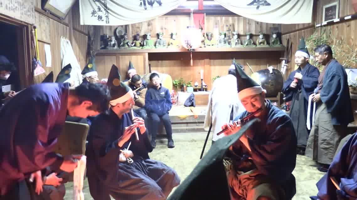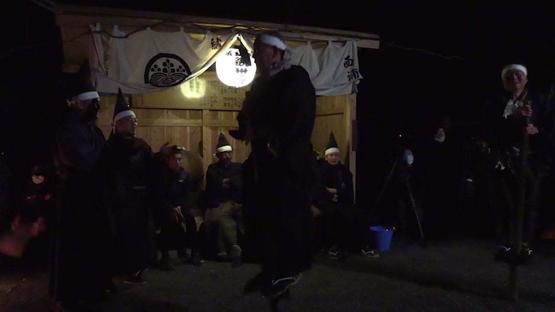 能楽の「田村」の謡にあわせて、しんたい面と2人の鬼面が舞う。