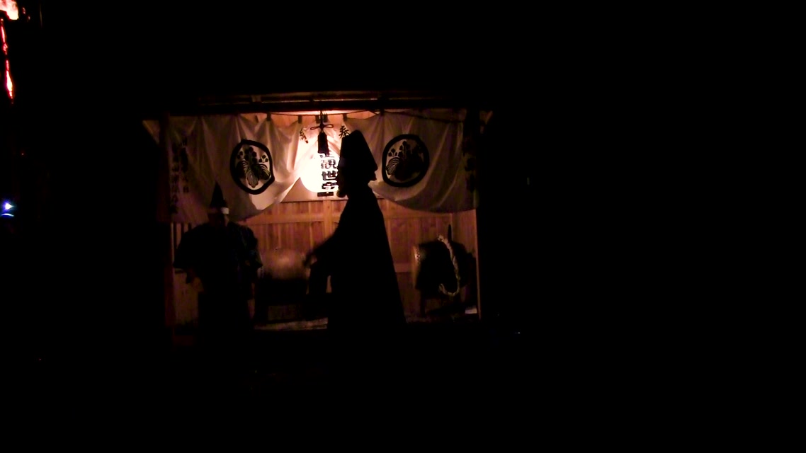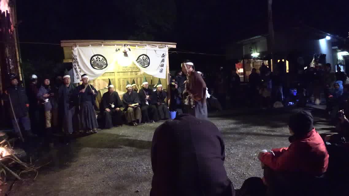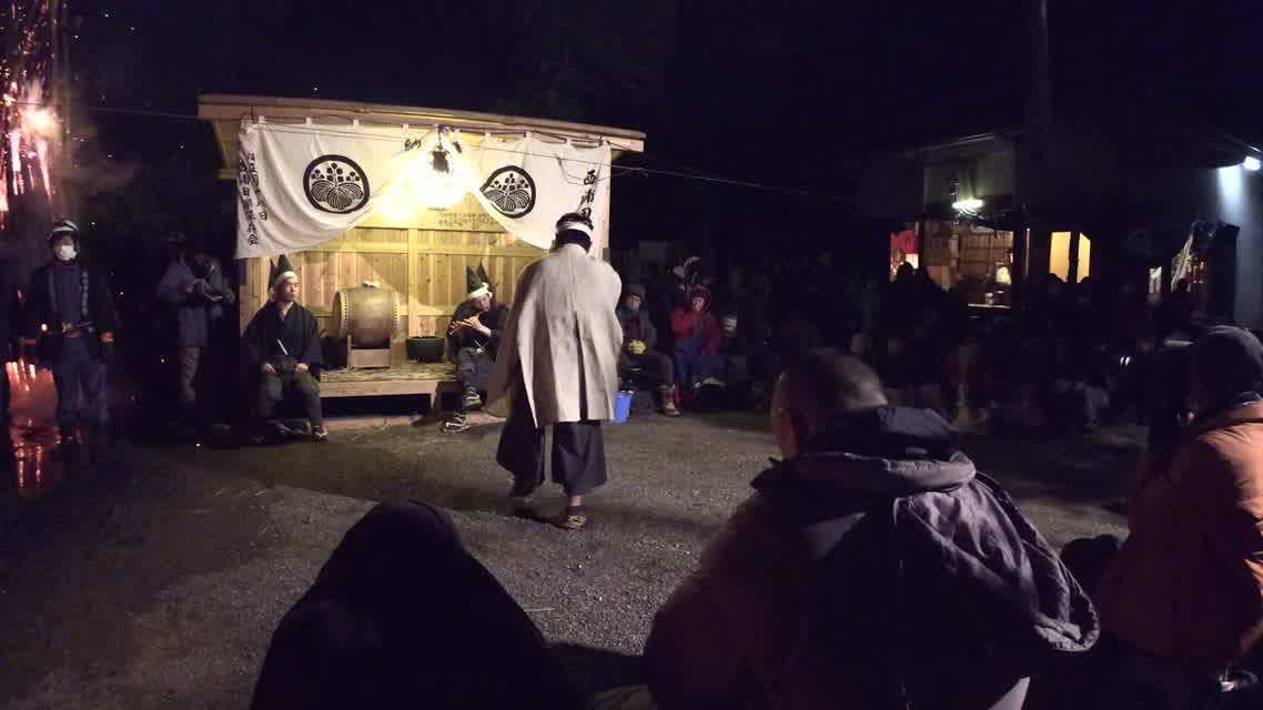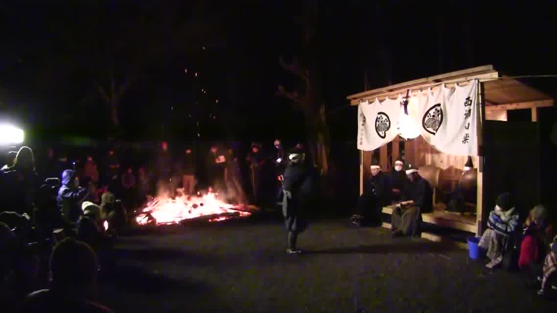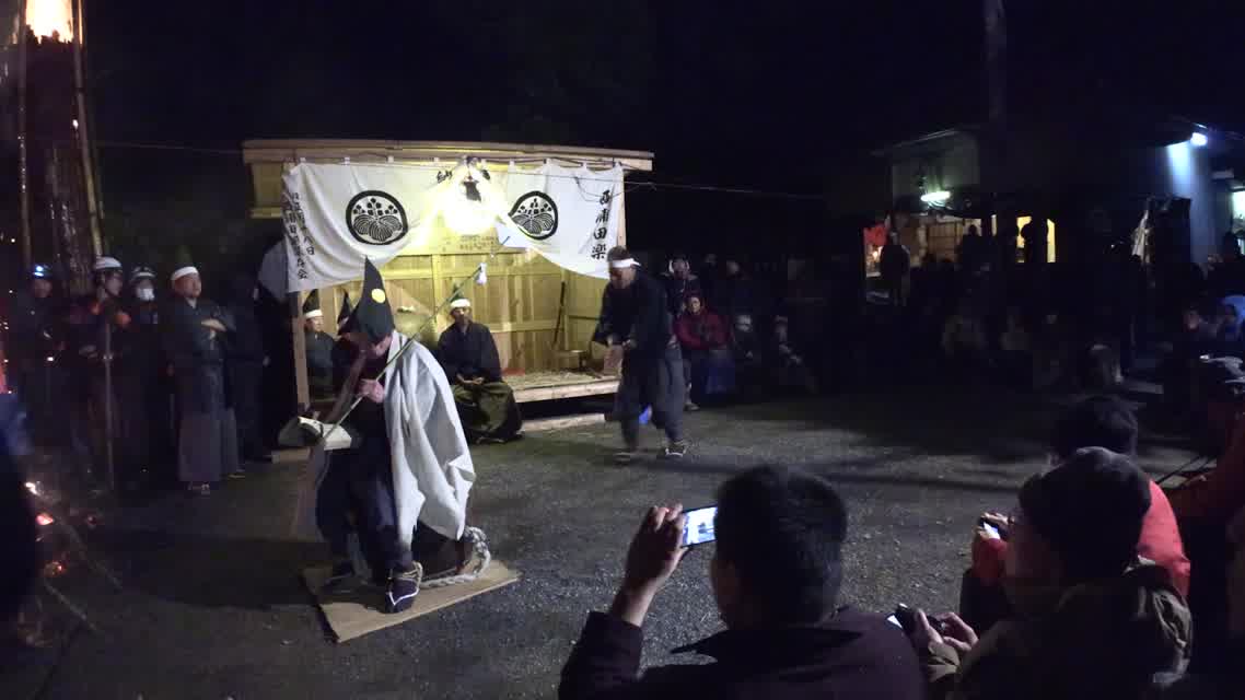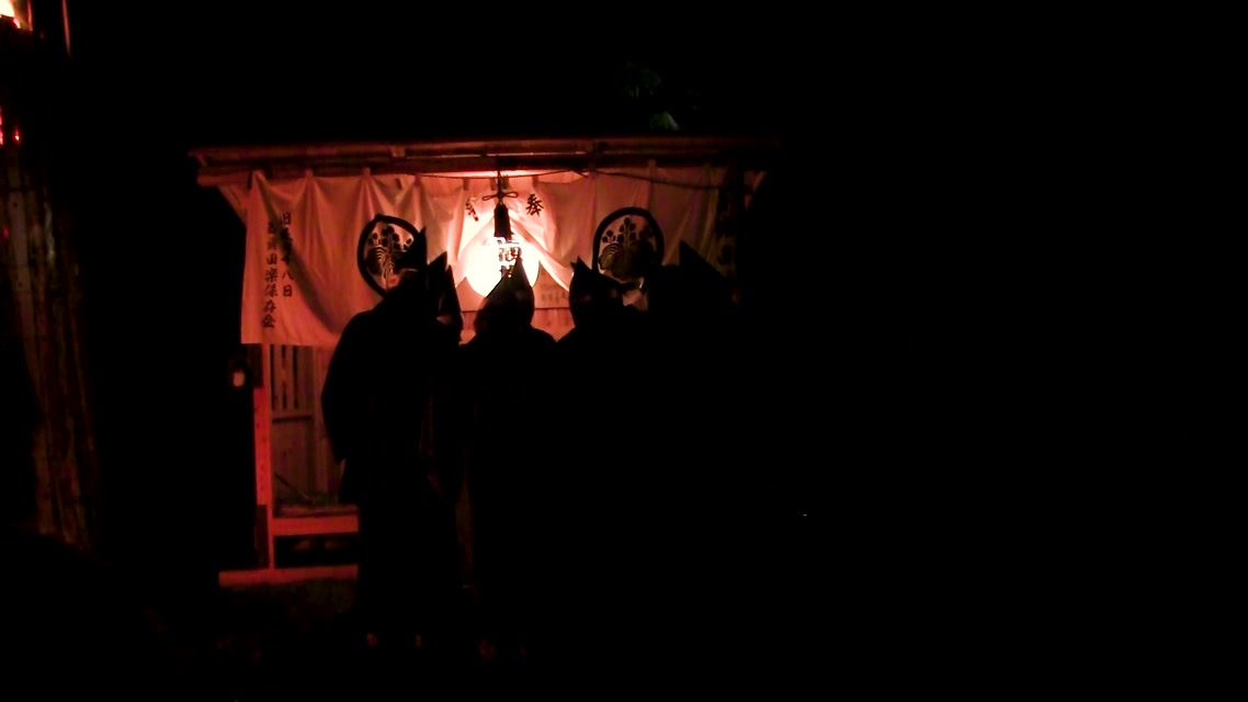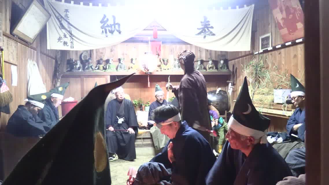 能楽の「田村」の謡にあわせて、しんたい面と2人の鬼面が舞う。