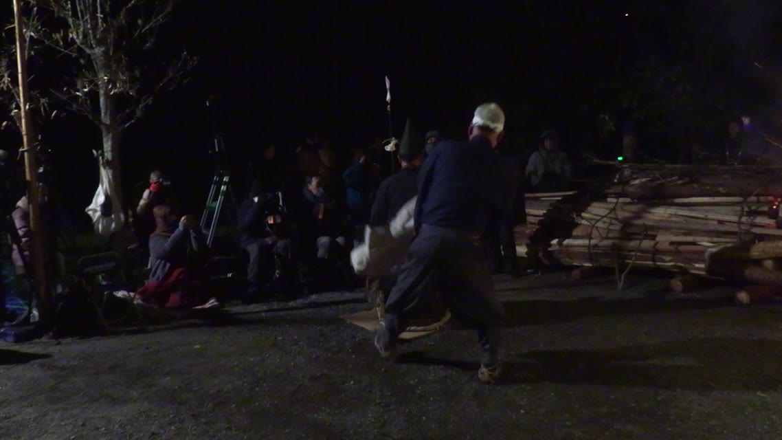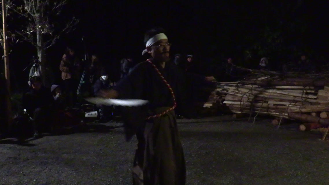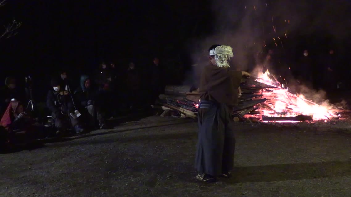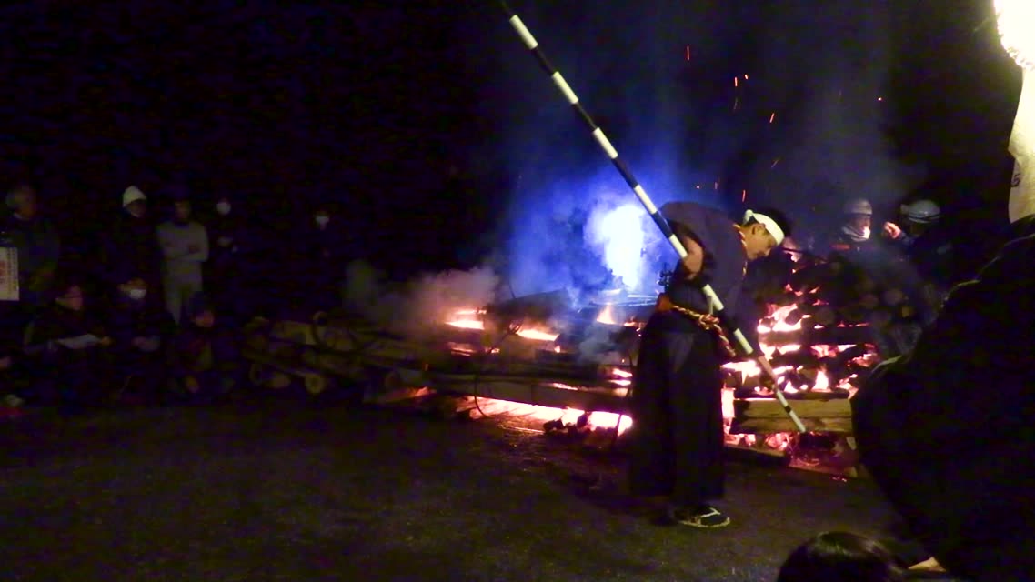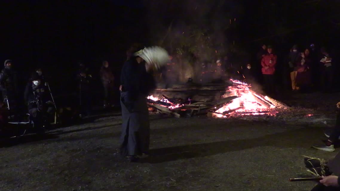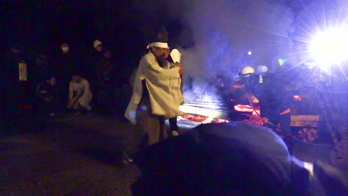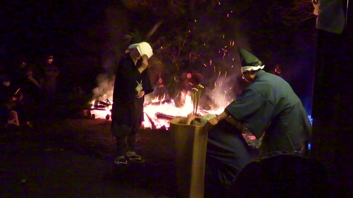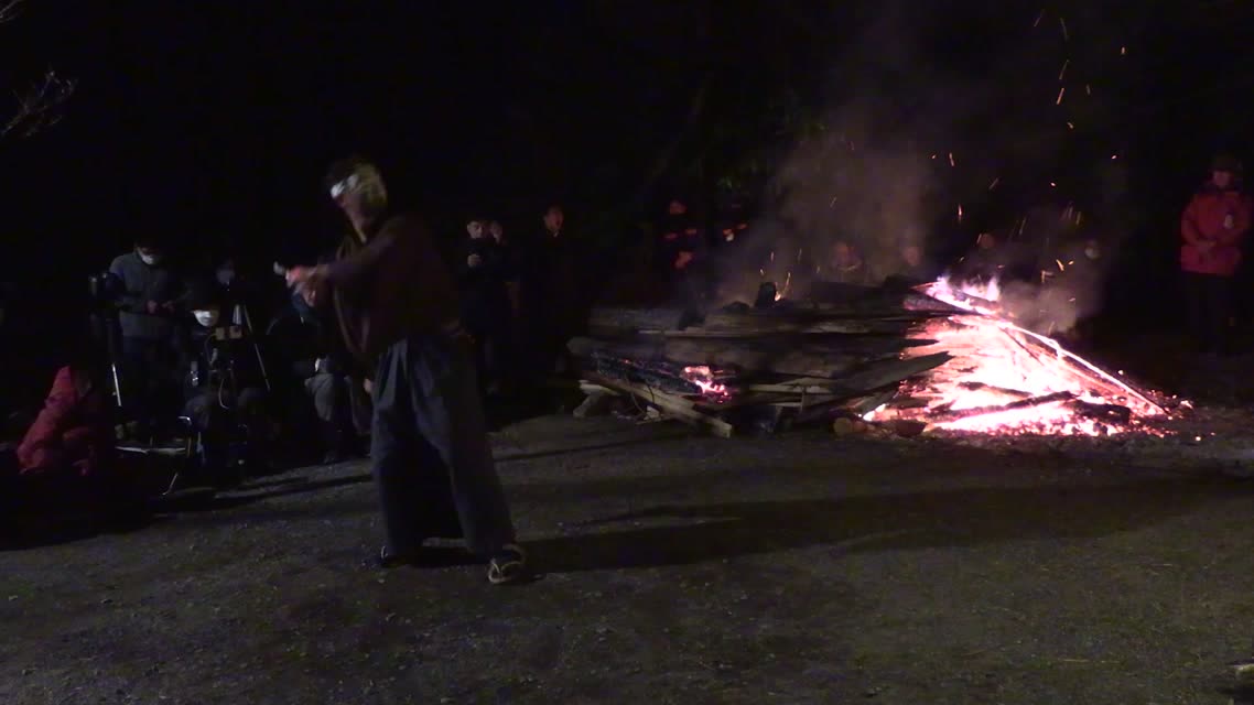 次の「舟渡し」に使う灯となる、庭火から抜き出したほだ(薪)を恵方に向けて煽る。