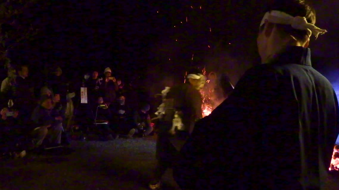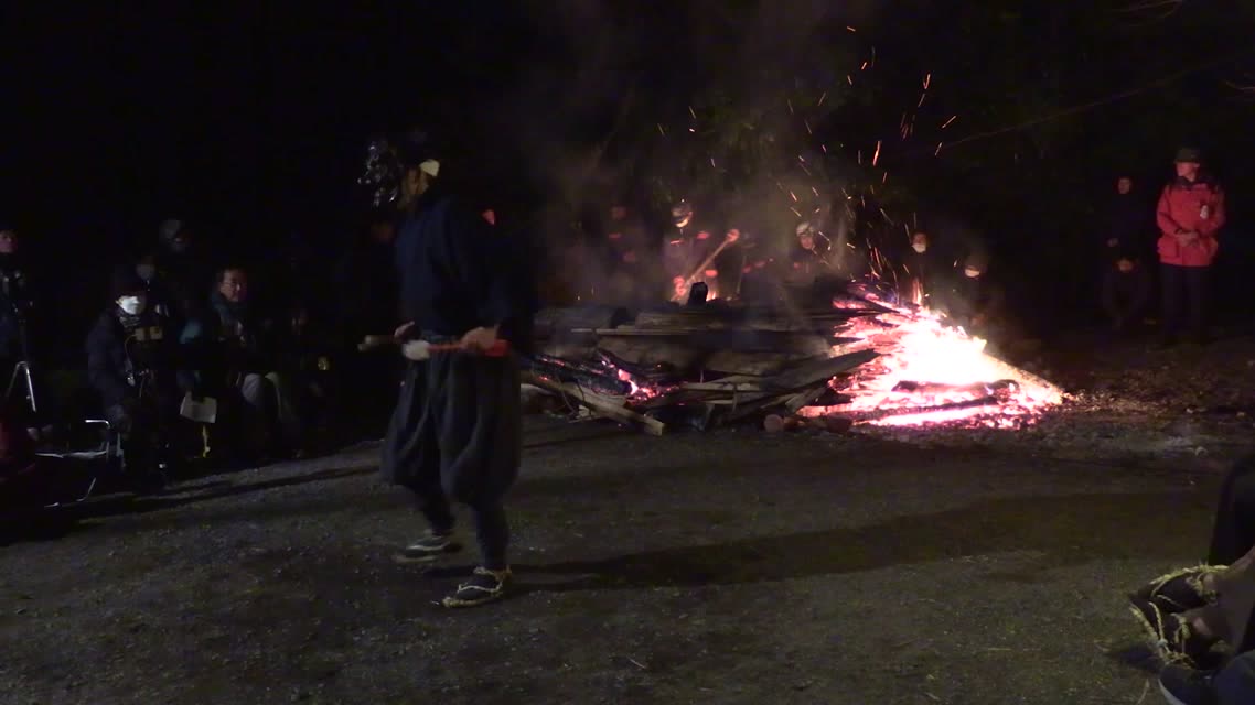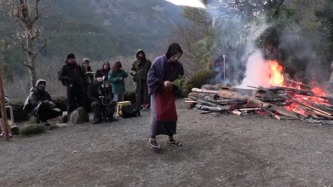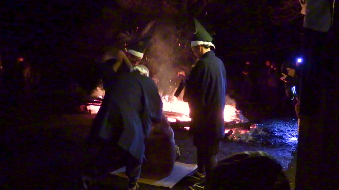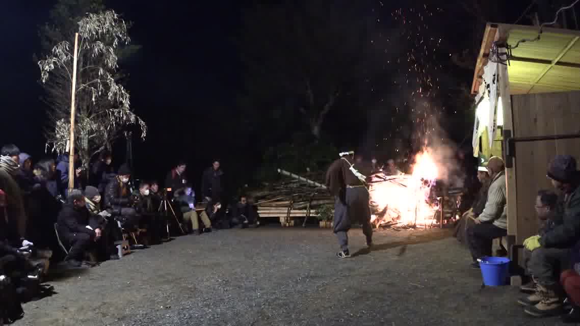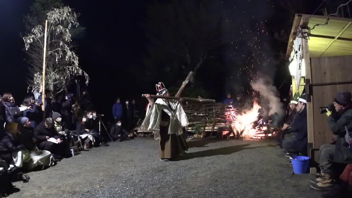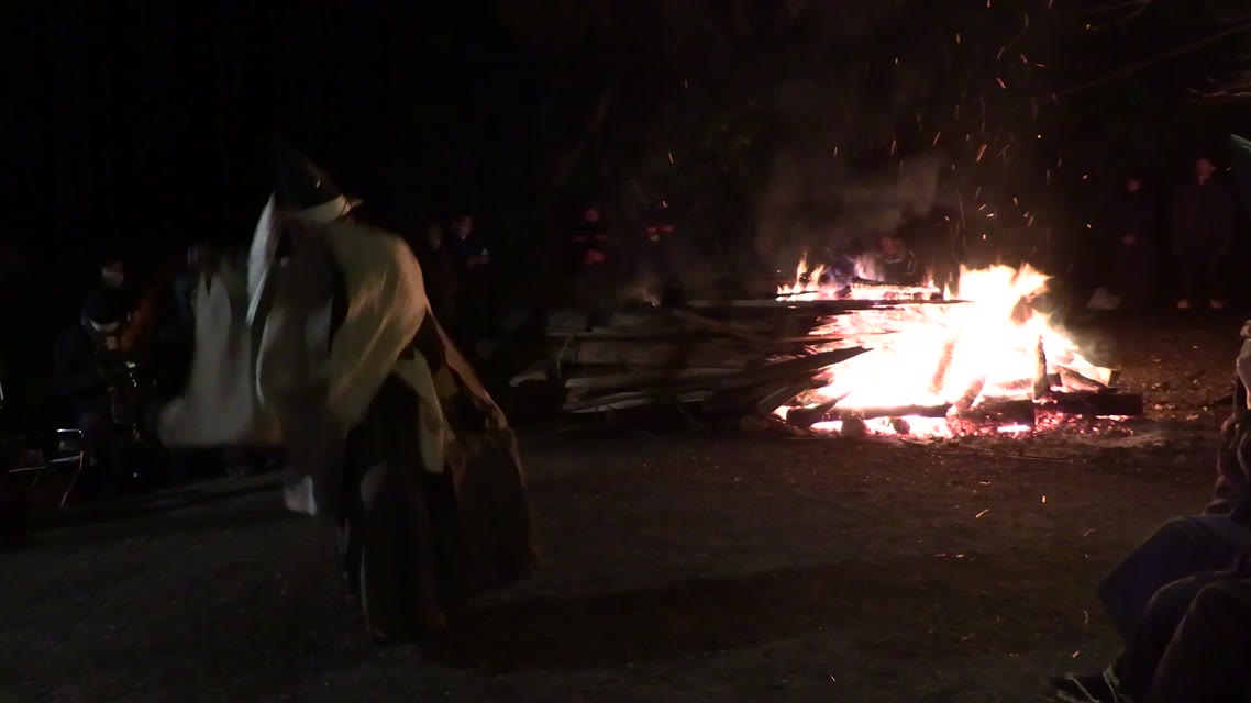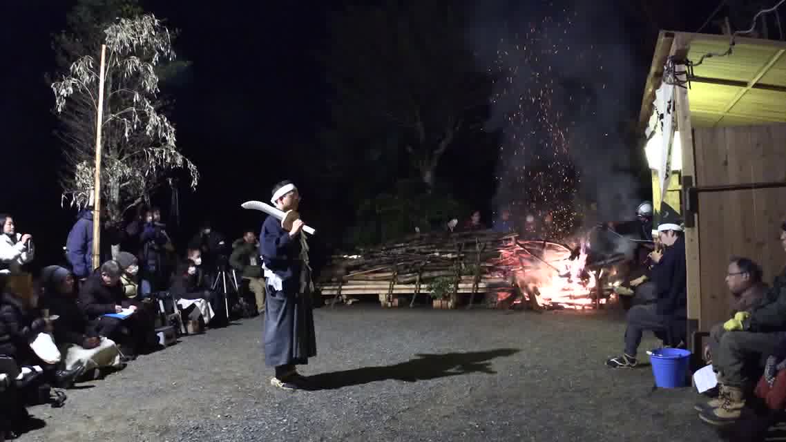 次の「舟渡し」に使う灯となる、庭火から抜き出したほだ(薪)を恵方に向けて煽る。
