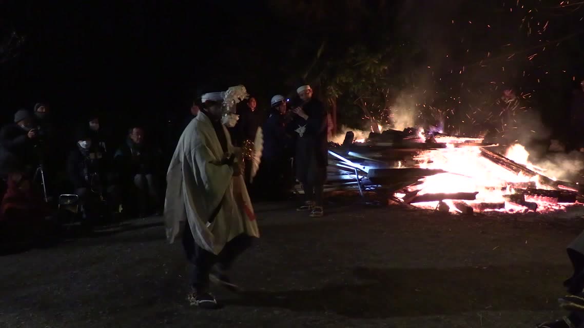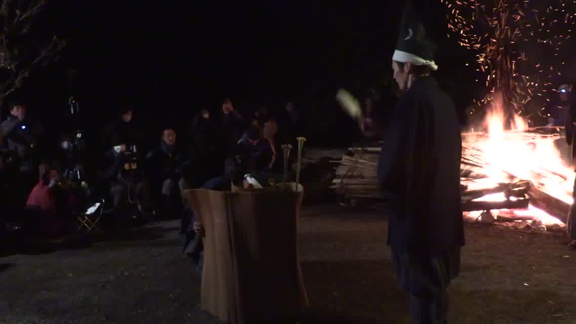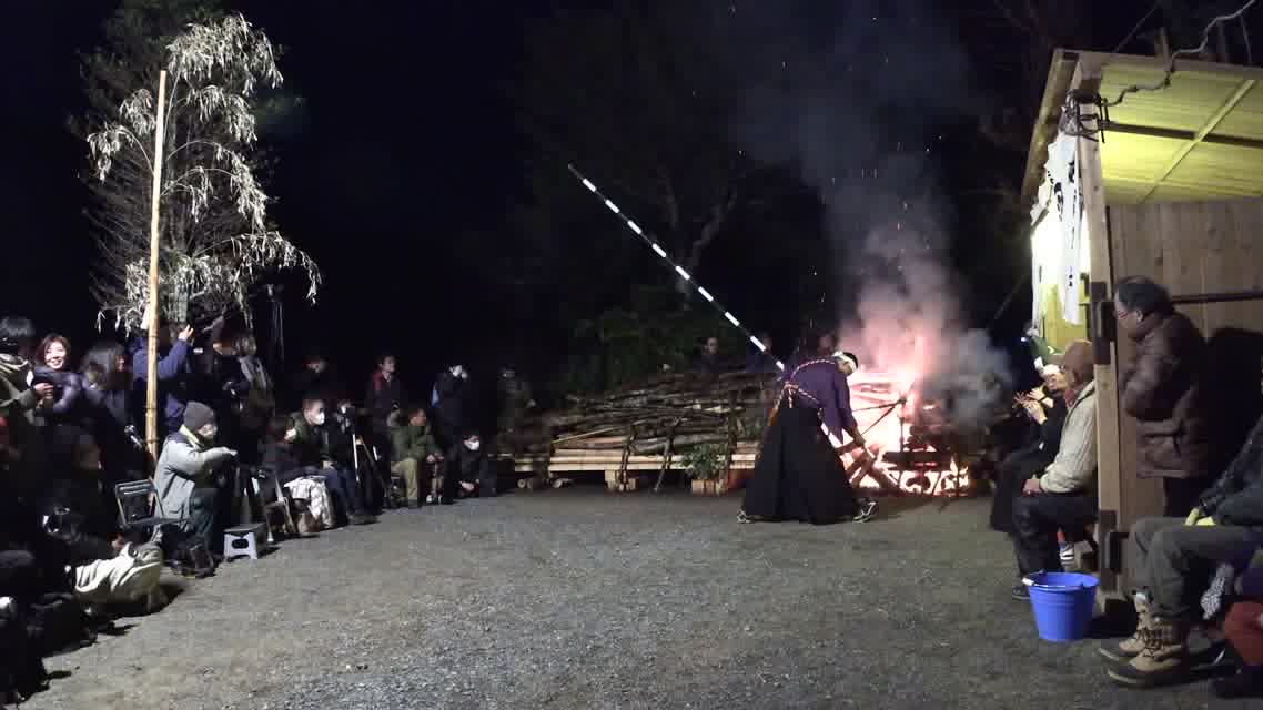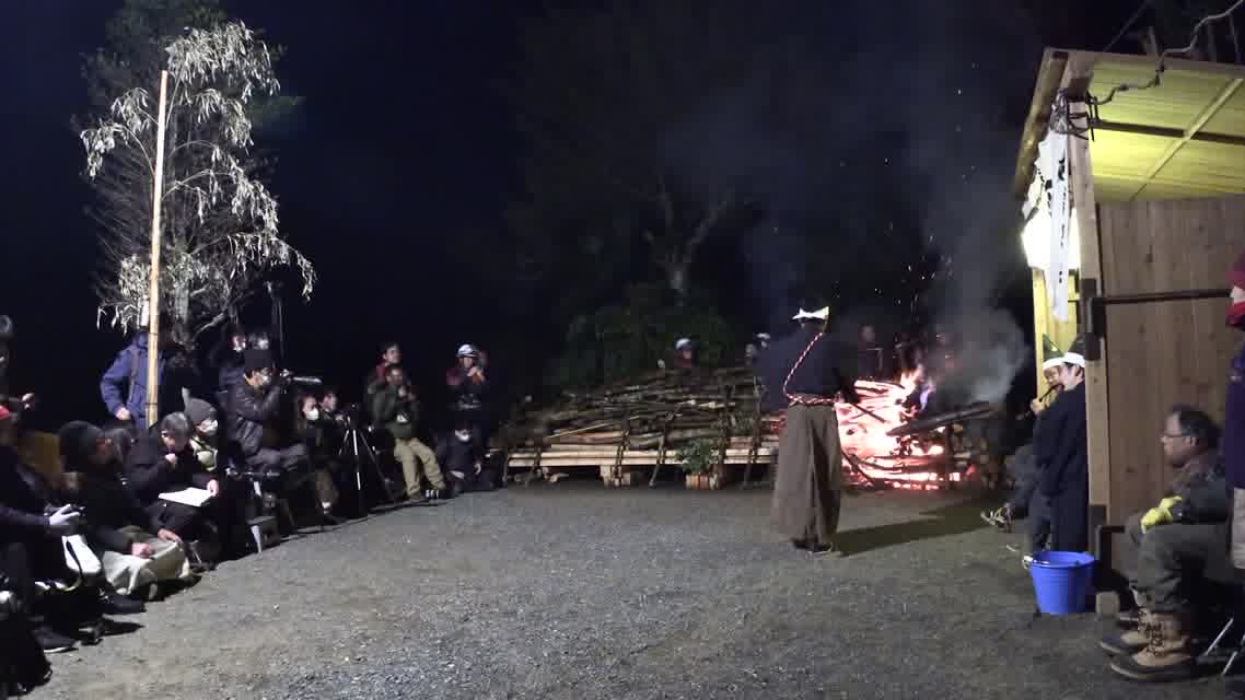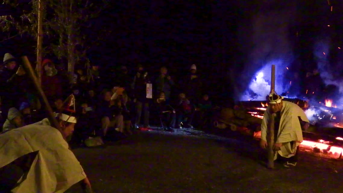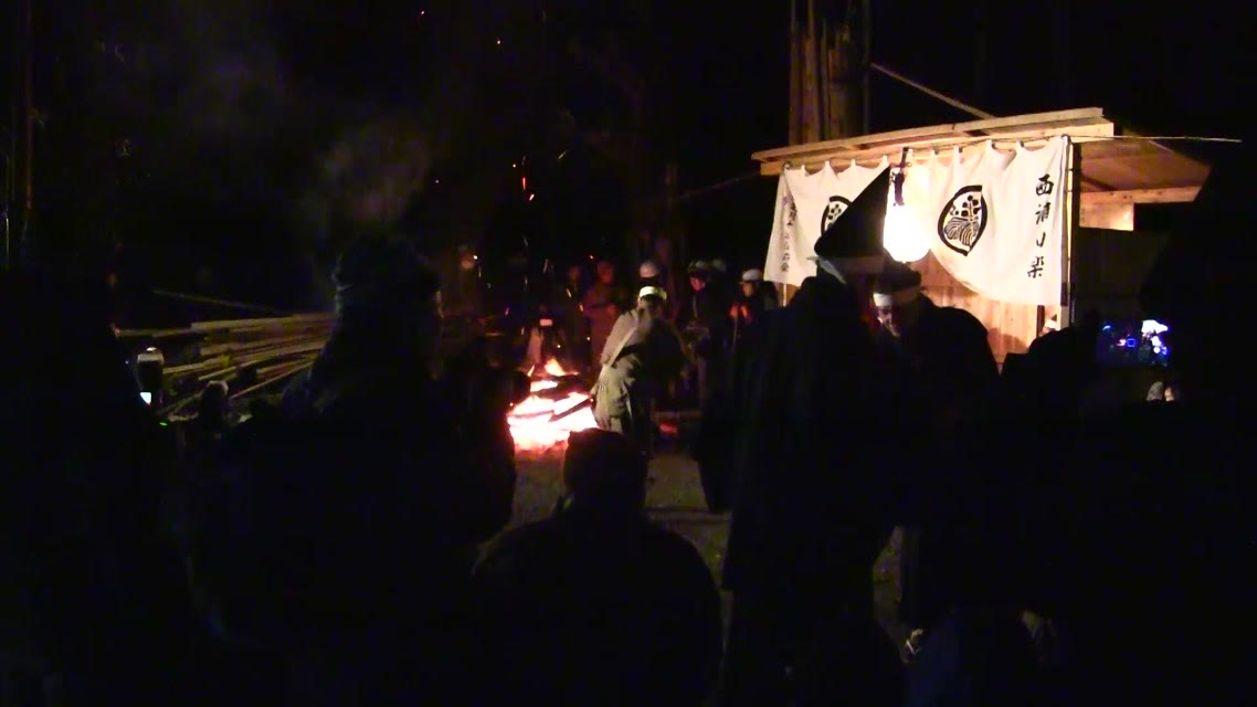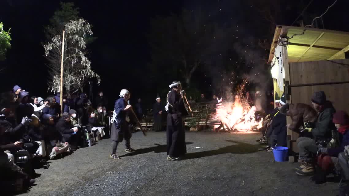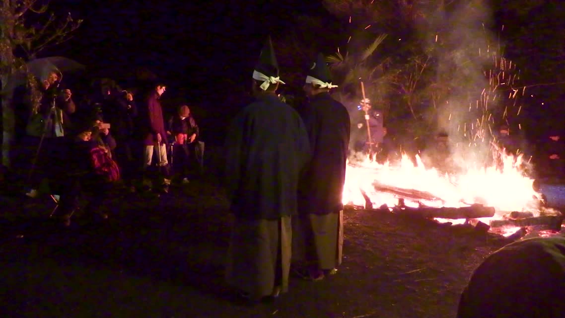 次の「舟渡し」に使う灯となる、庭火から抜き出したほだ(薪)を恵方に向けて煽る。