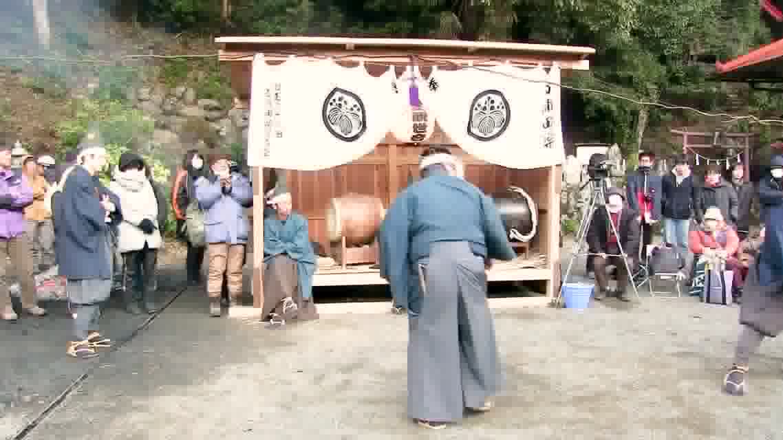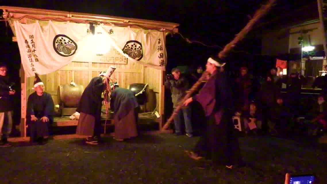能衆全員が太鼓を桑柄で打ち、田起しのさまを表す。