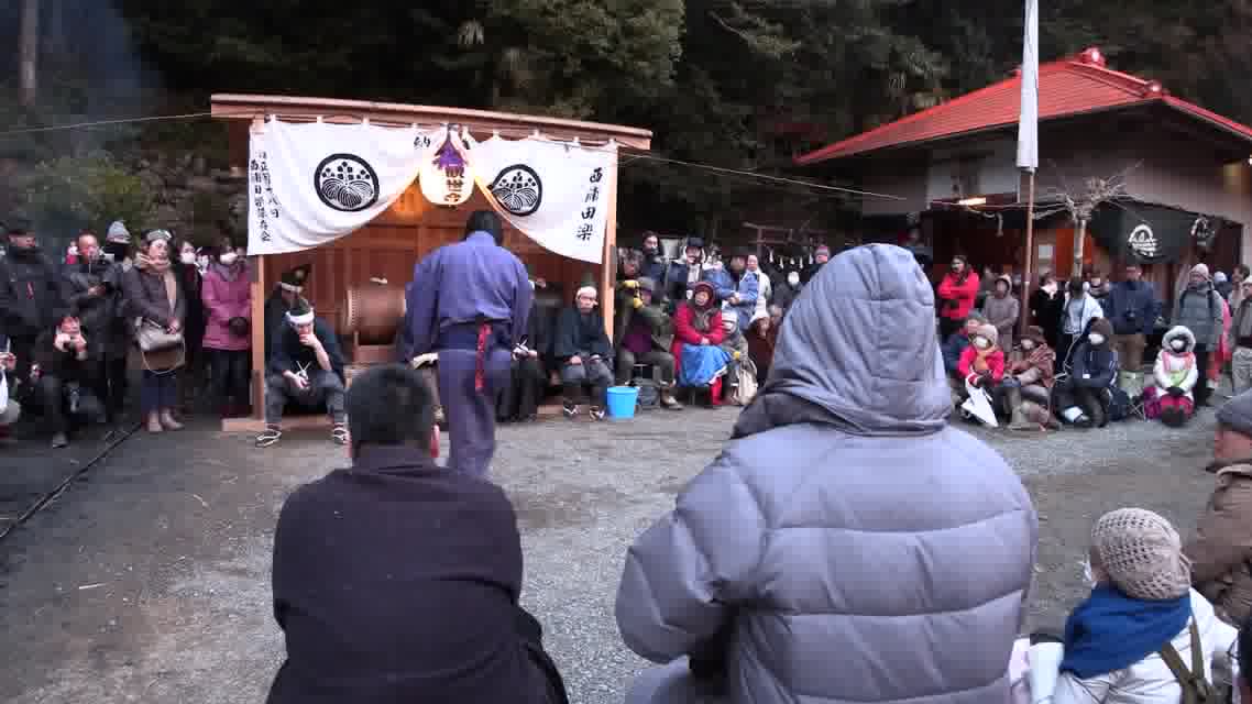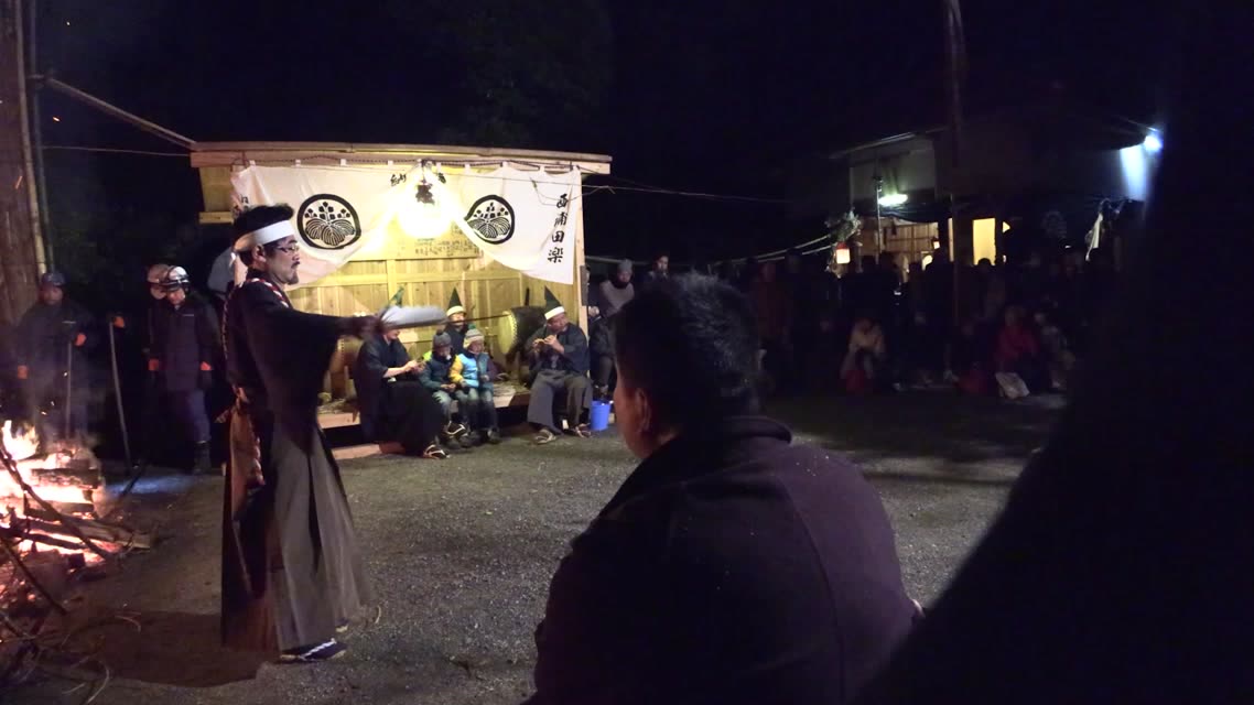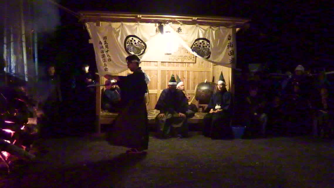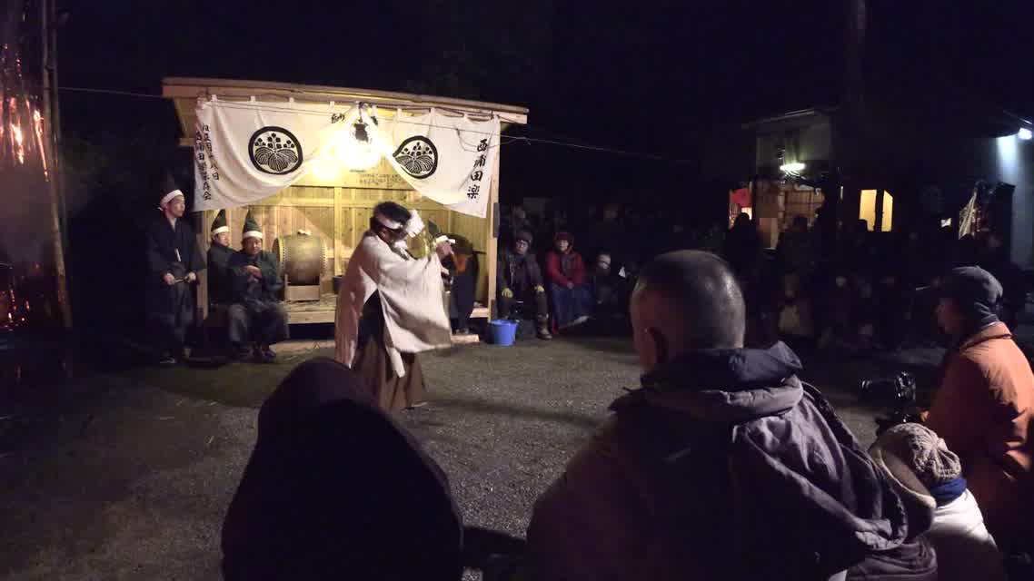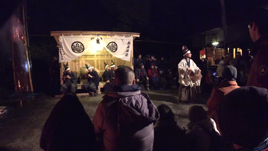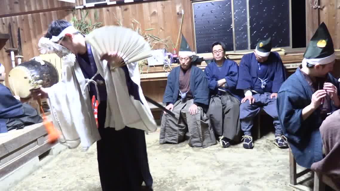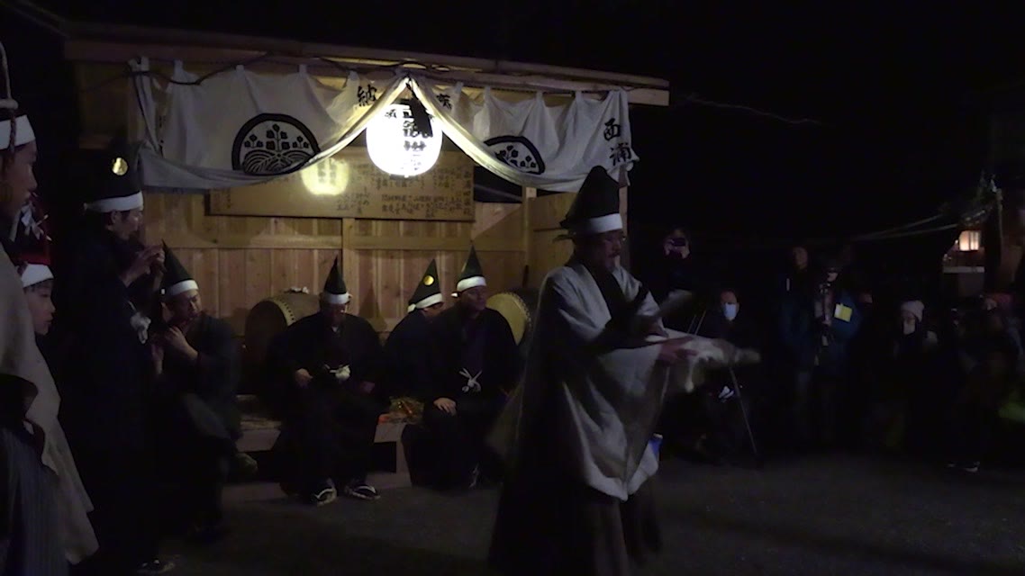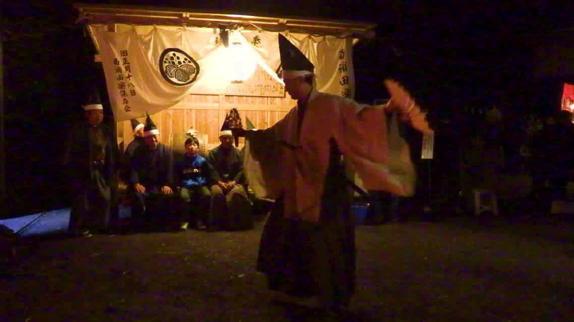 新年を寿いて豊作を願い、舞庭を清める演目。能衆全員が楽堂の前に集まり、神歌を唱和する。終わると、タヨガミによるタイハイがある。