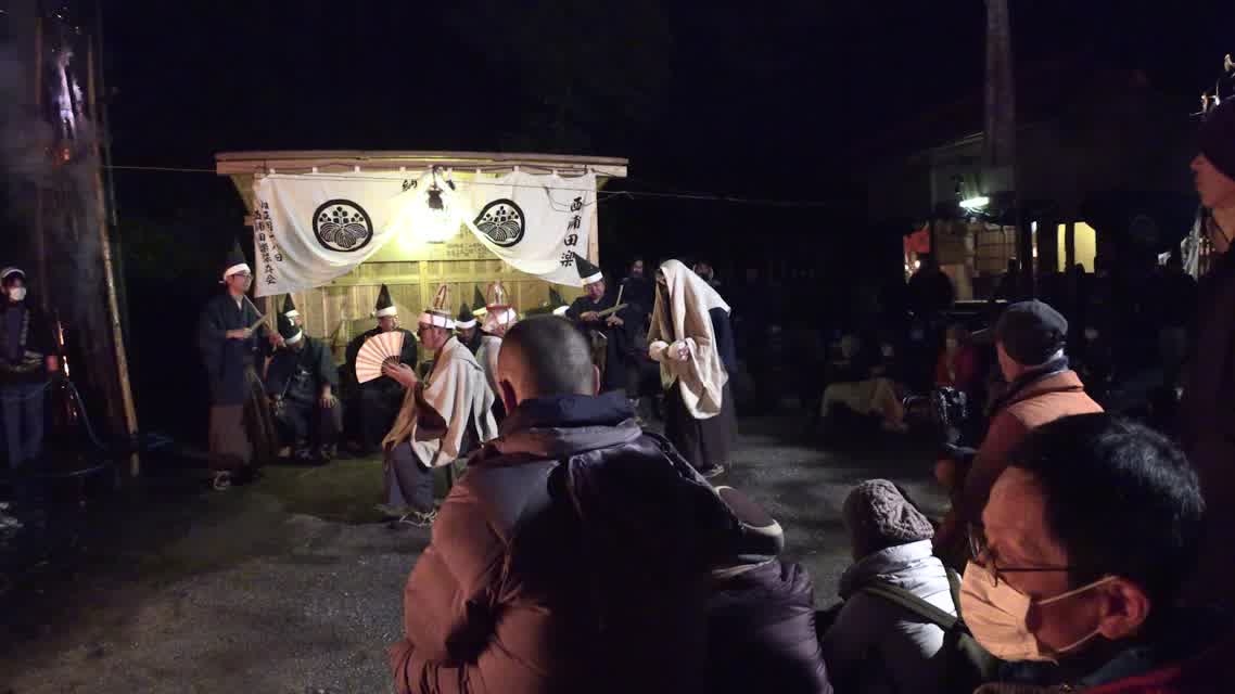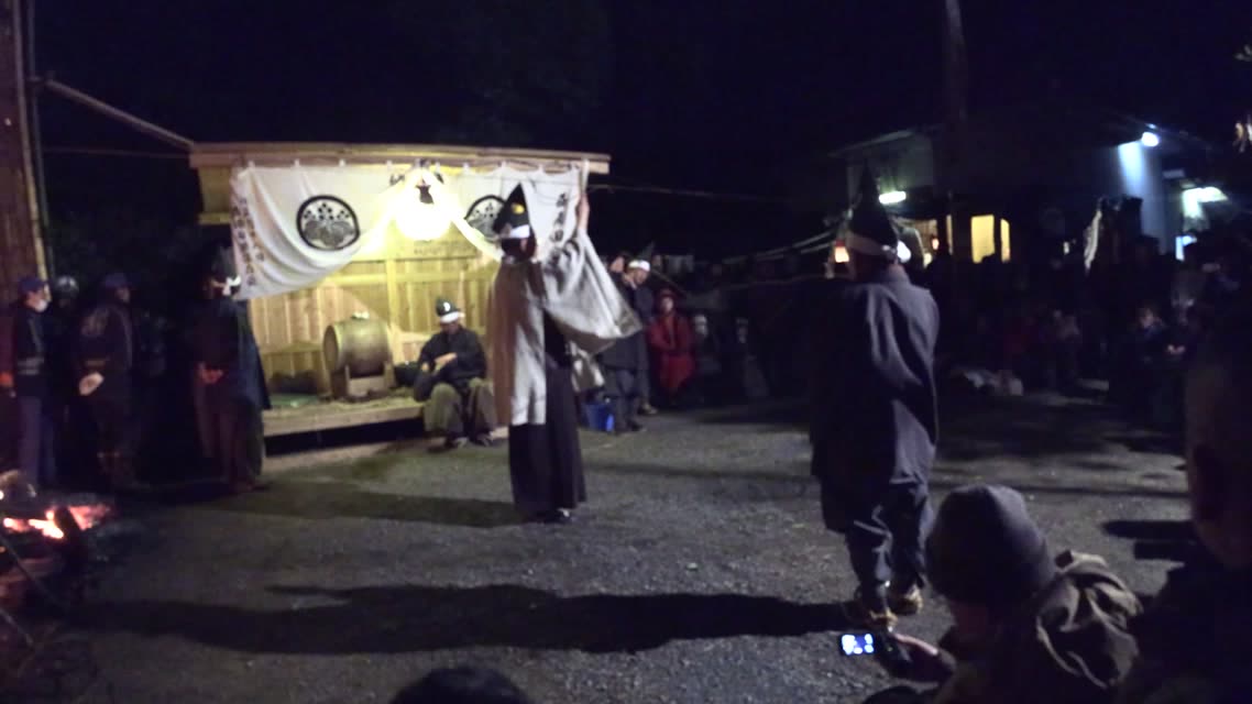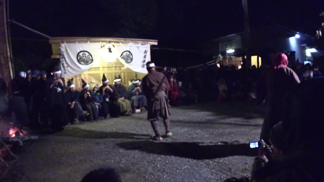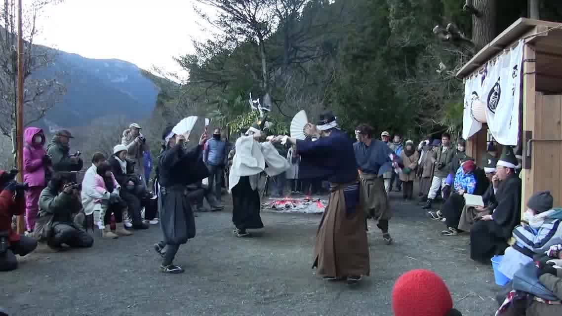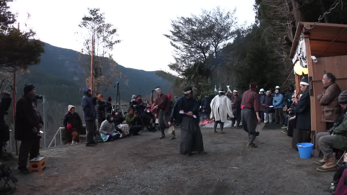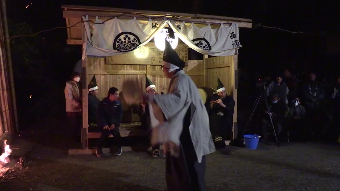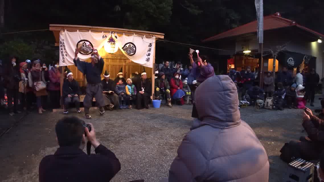 新年を寿いて豊作を願い、舞庭を清める演目。能衆全員が楽堂の前に集まり、神歌を唱和する。終わると、タヨガミによるタイハイがある。