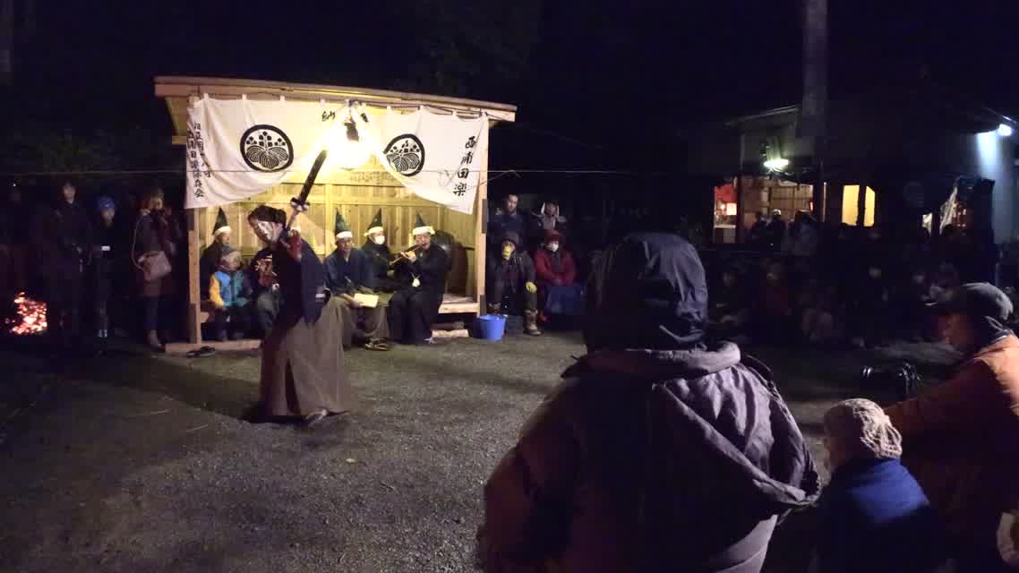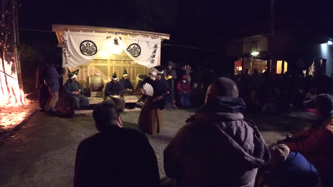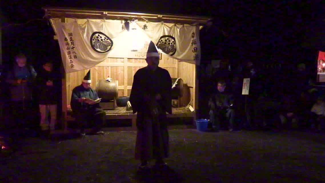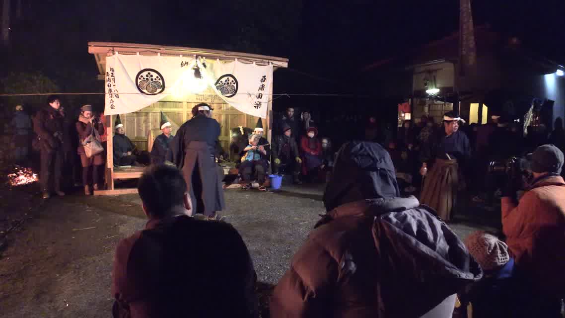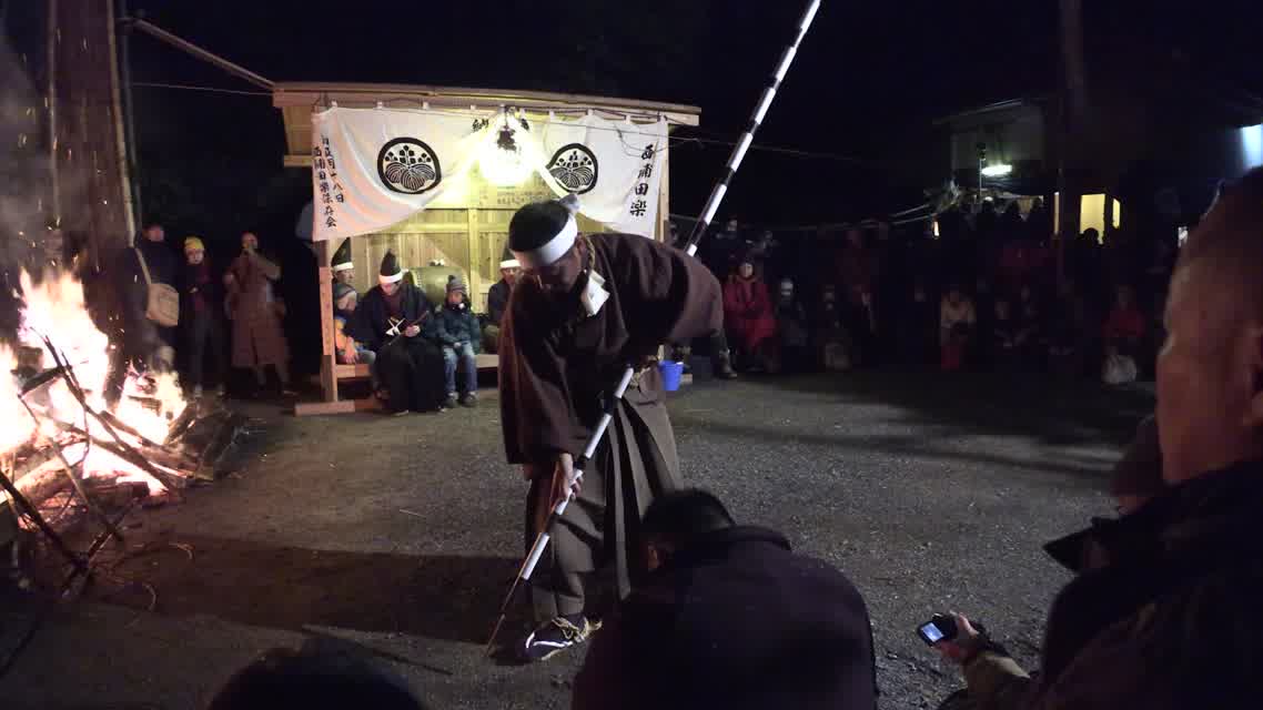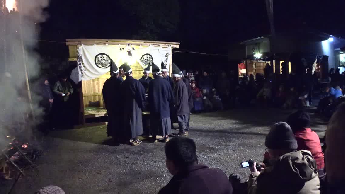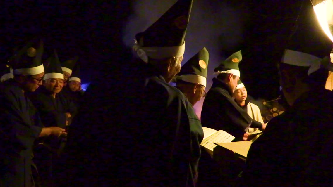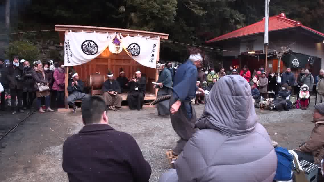 新年を寿いて豊作を願い、舞庭を清める演目。能衆全員が楽堂の前に集まり、神歌を唱和する。終わると、タヨガミによるタイハイがある。