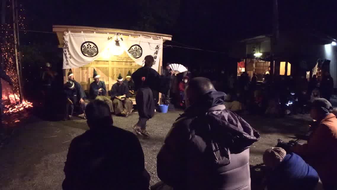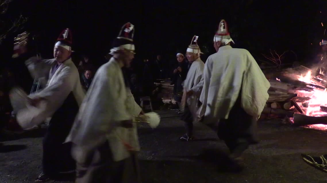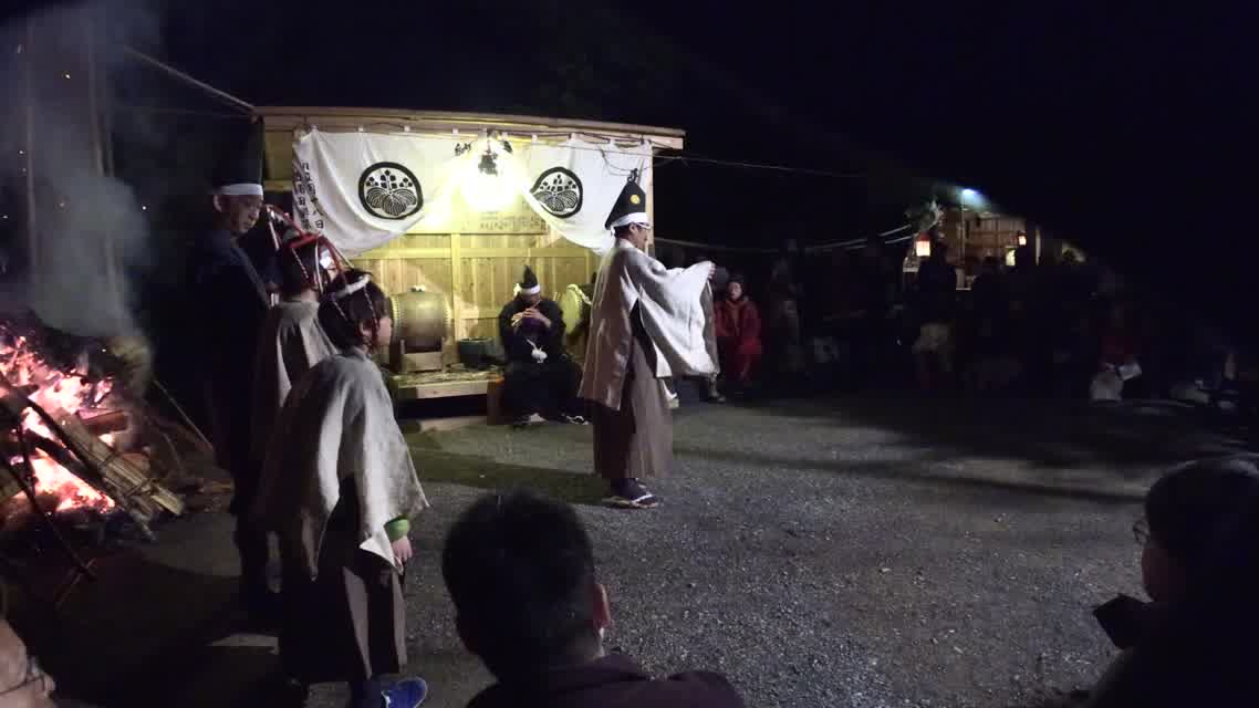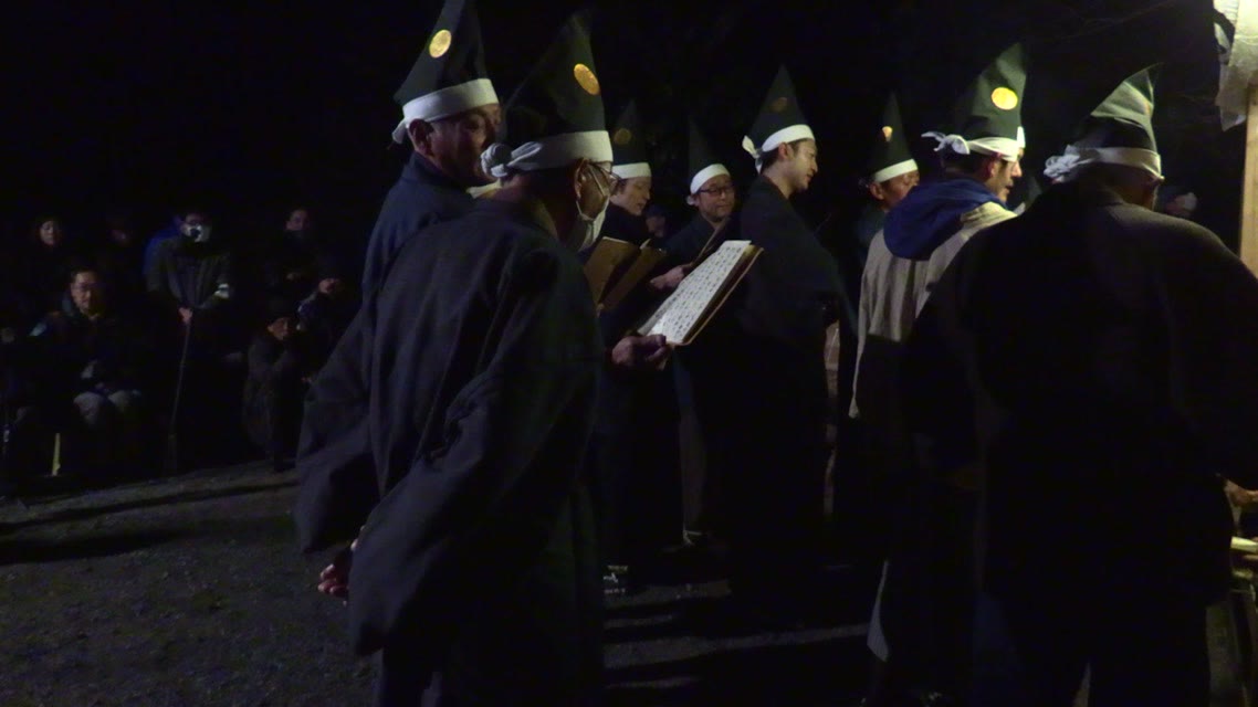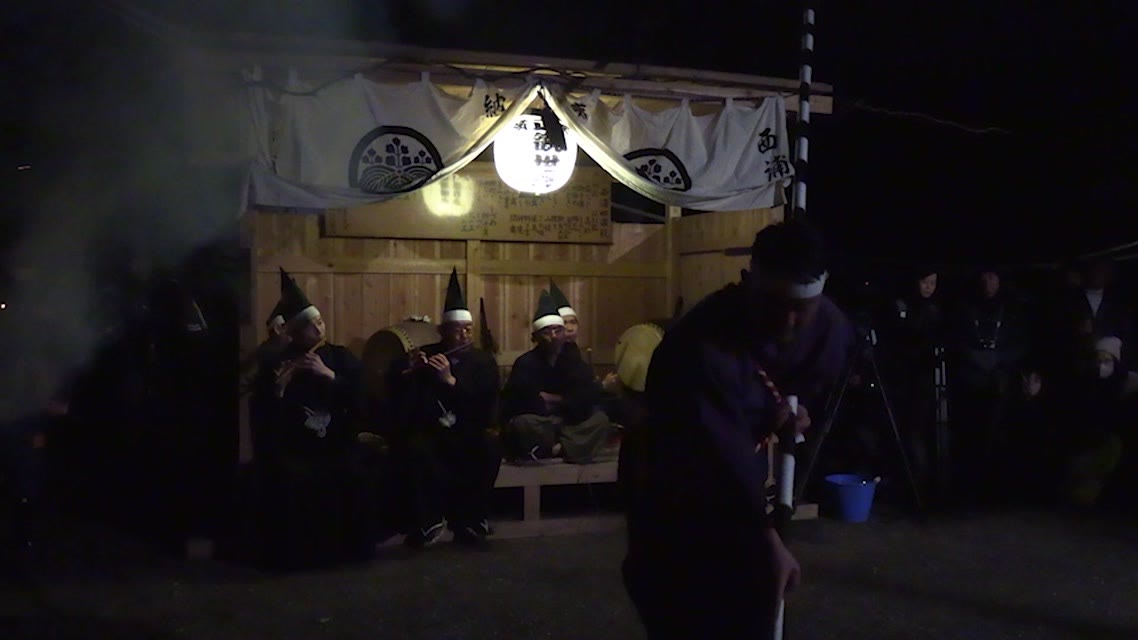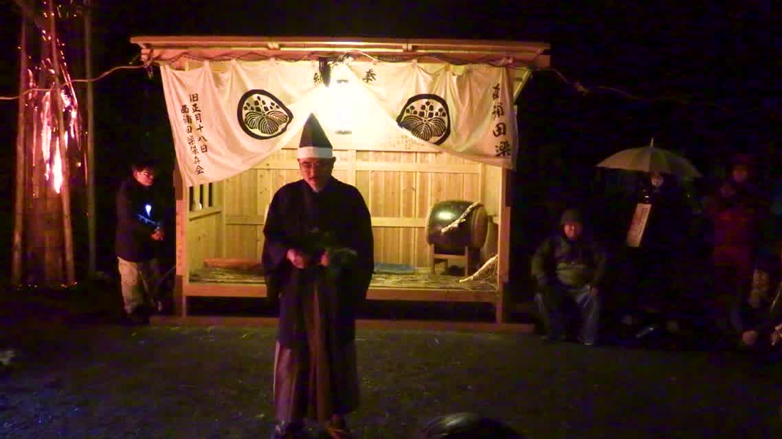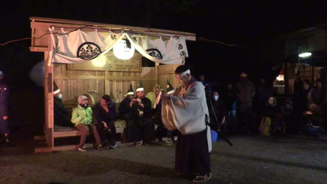 新年を寿いて豊作を願い、舞庭を清める演目。能衆全員が楽堂の前に集まり、神歌を唱和する。終わると、タヨガミによるタイハイがある。