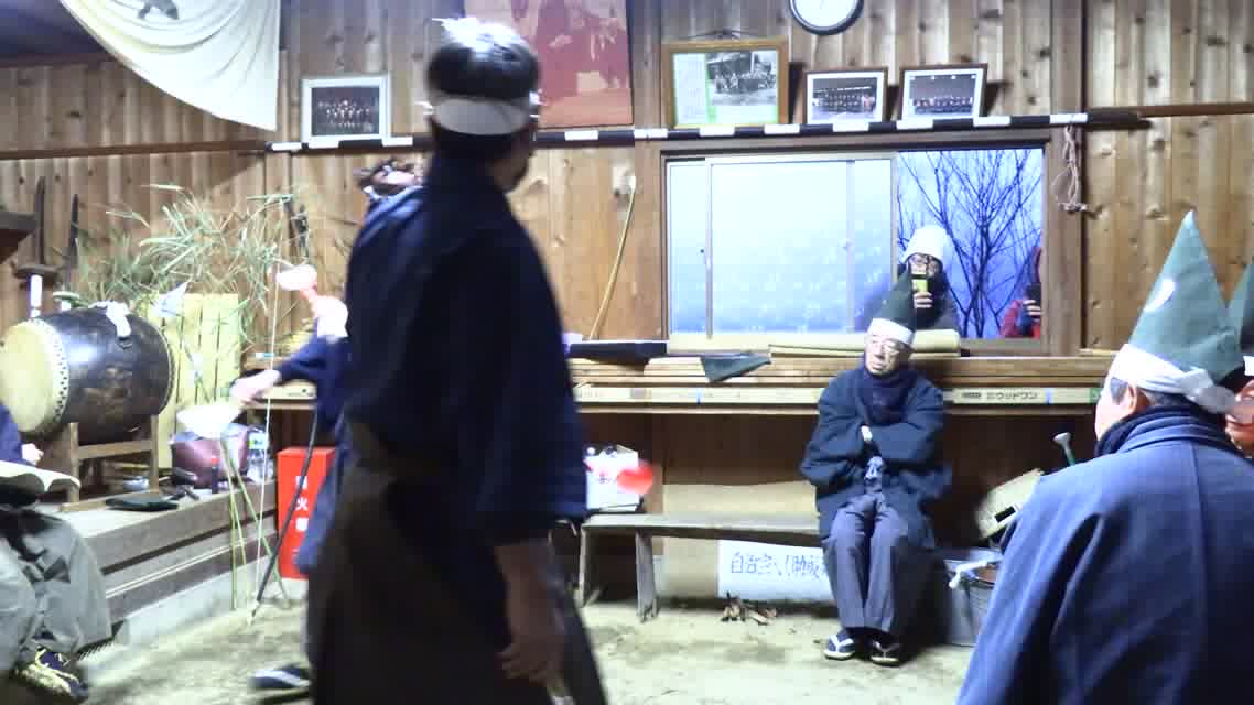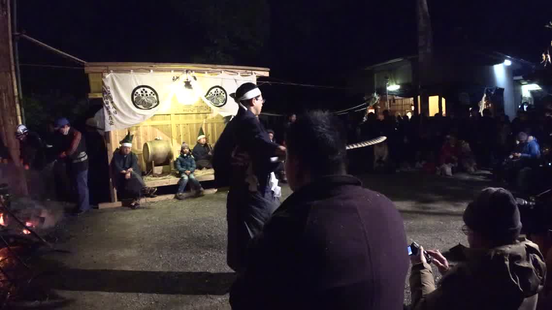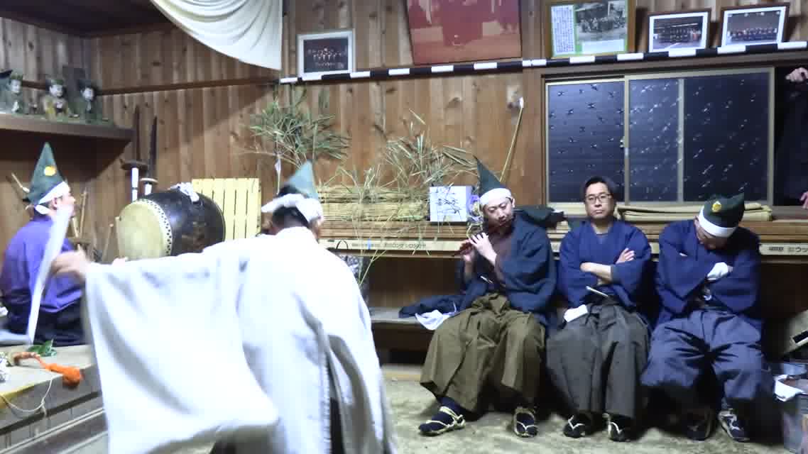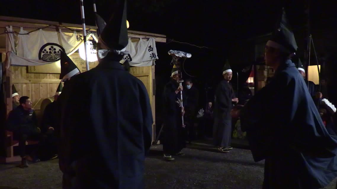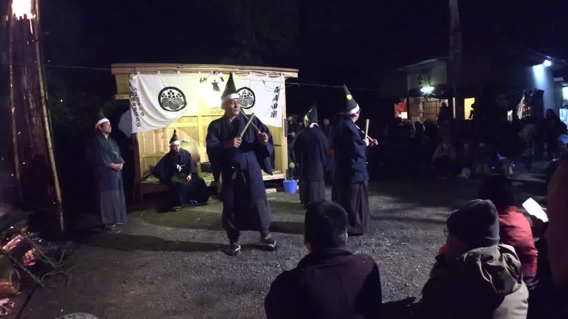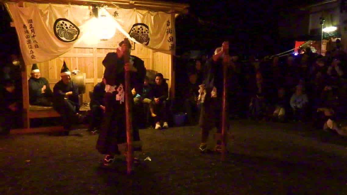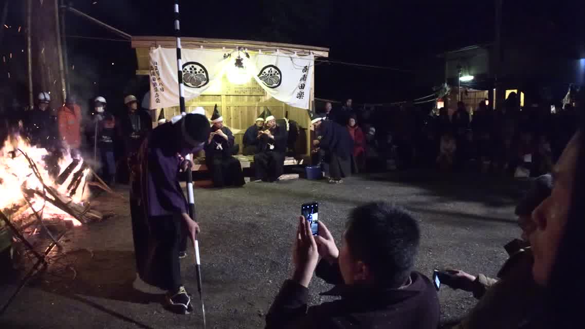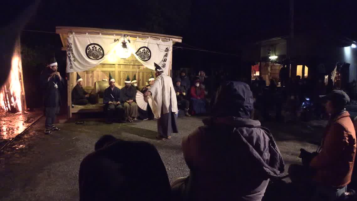 新年を寿いて豊作を願い、舞庭を清める演目。能衆全員が楽堂の前に集まり、神歌を唱和する。終わると、タヨガミによるタイハイがある。