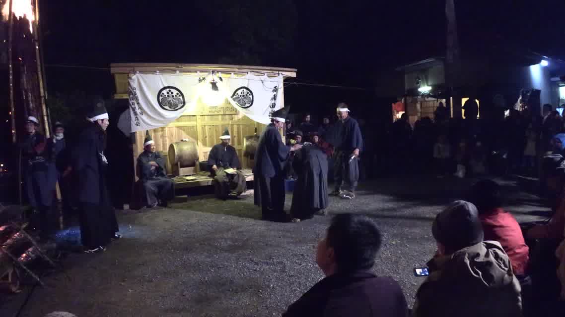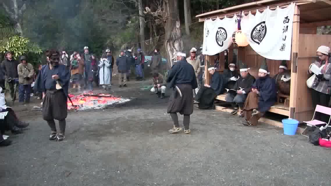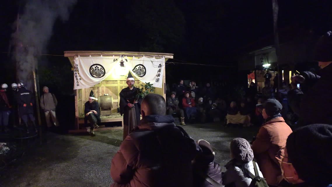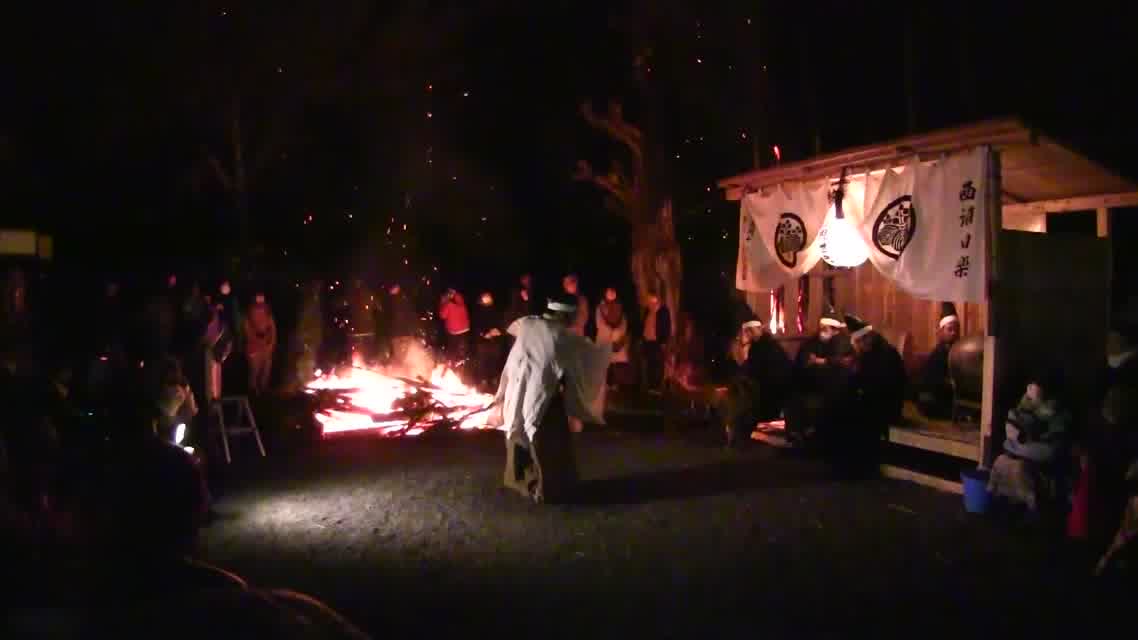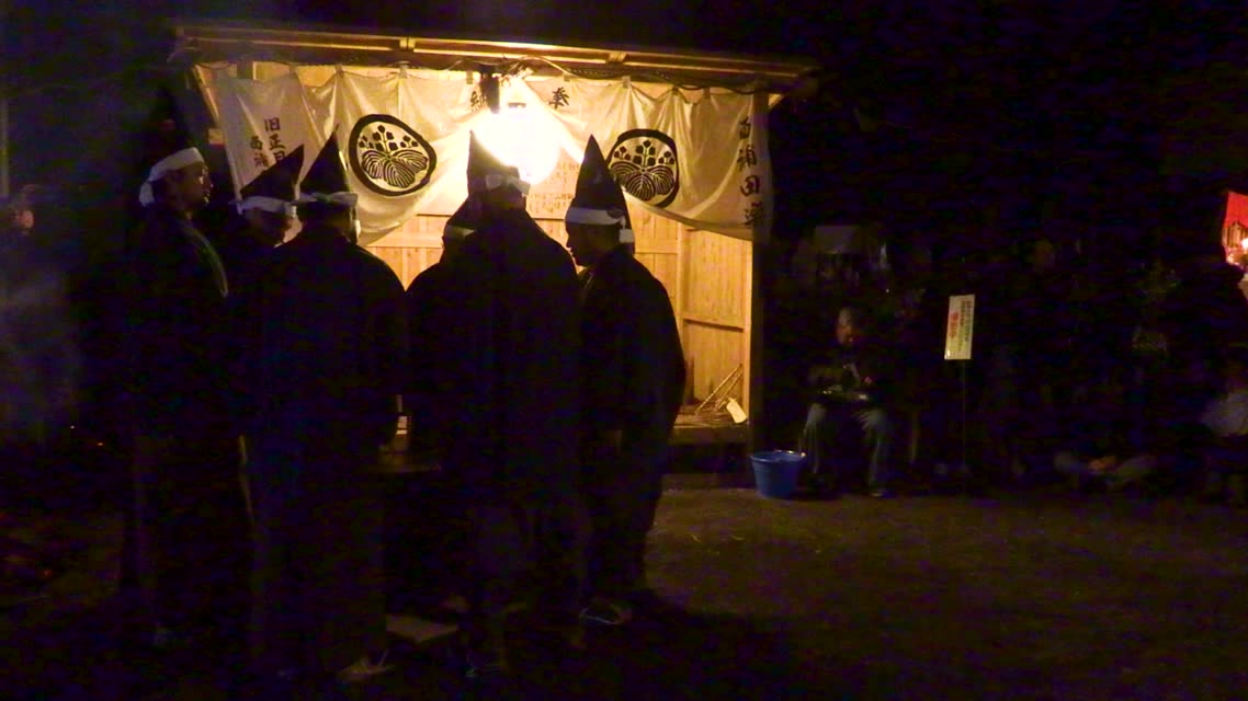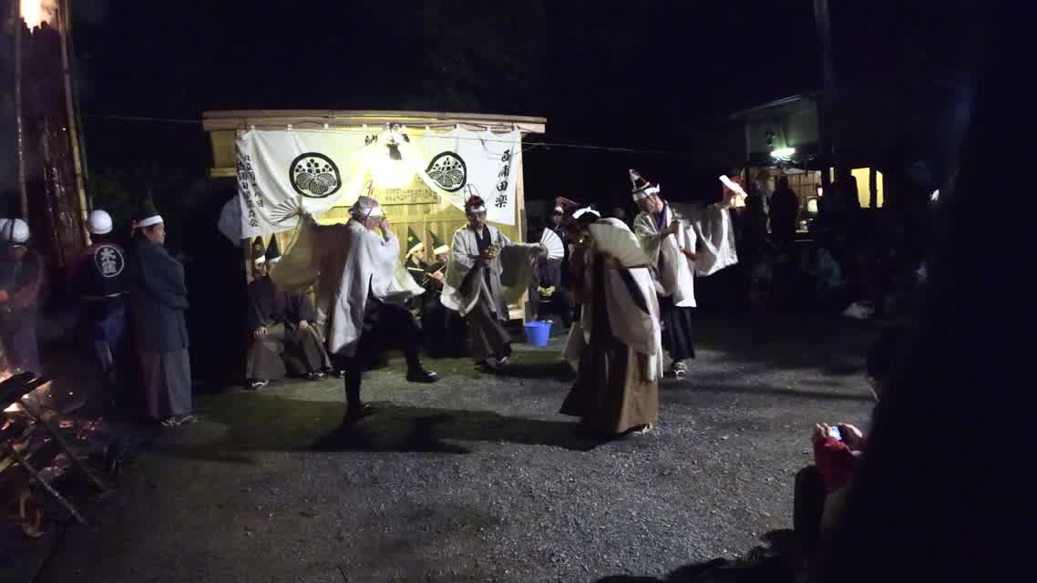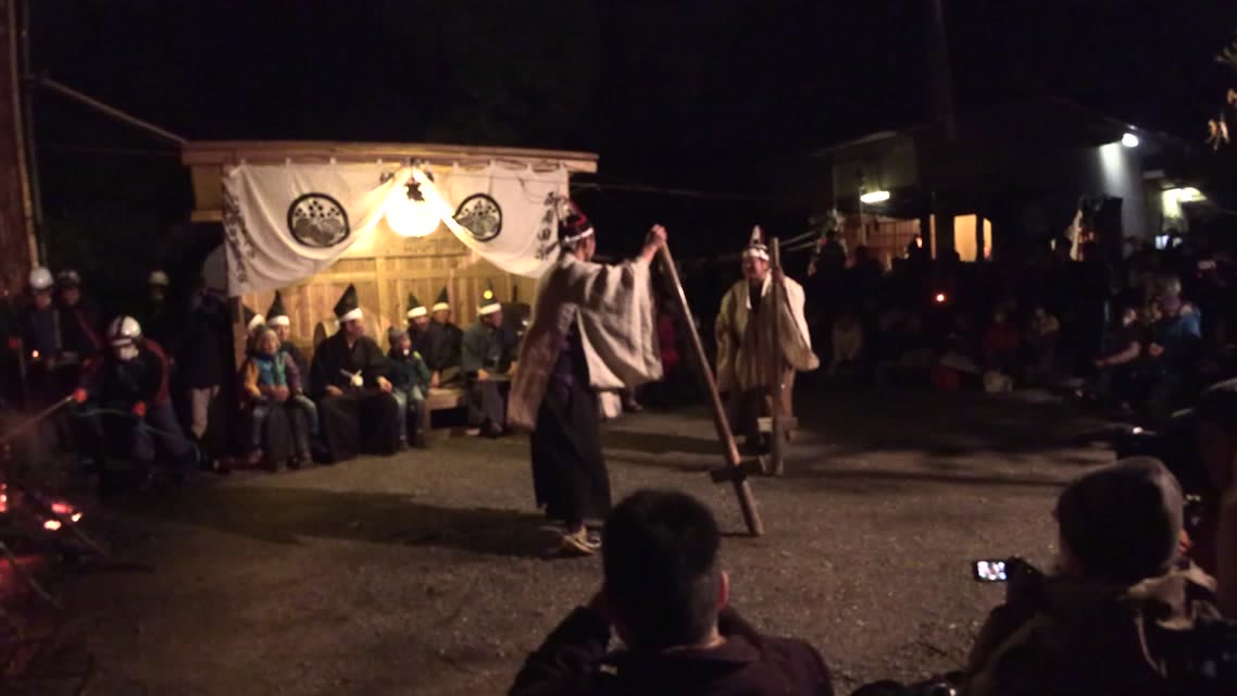新年を寿いて豊作を願い、舞庭を清める演目。能衆全員が楽堂の前に集まり、神歌を唱和する。終わると、タヨガミによるタイハイがある。