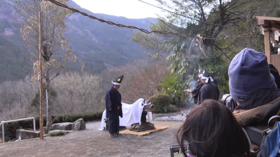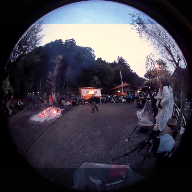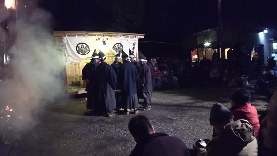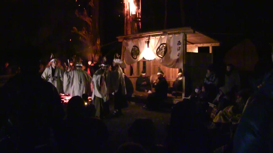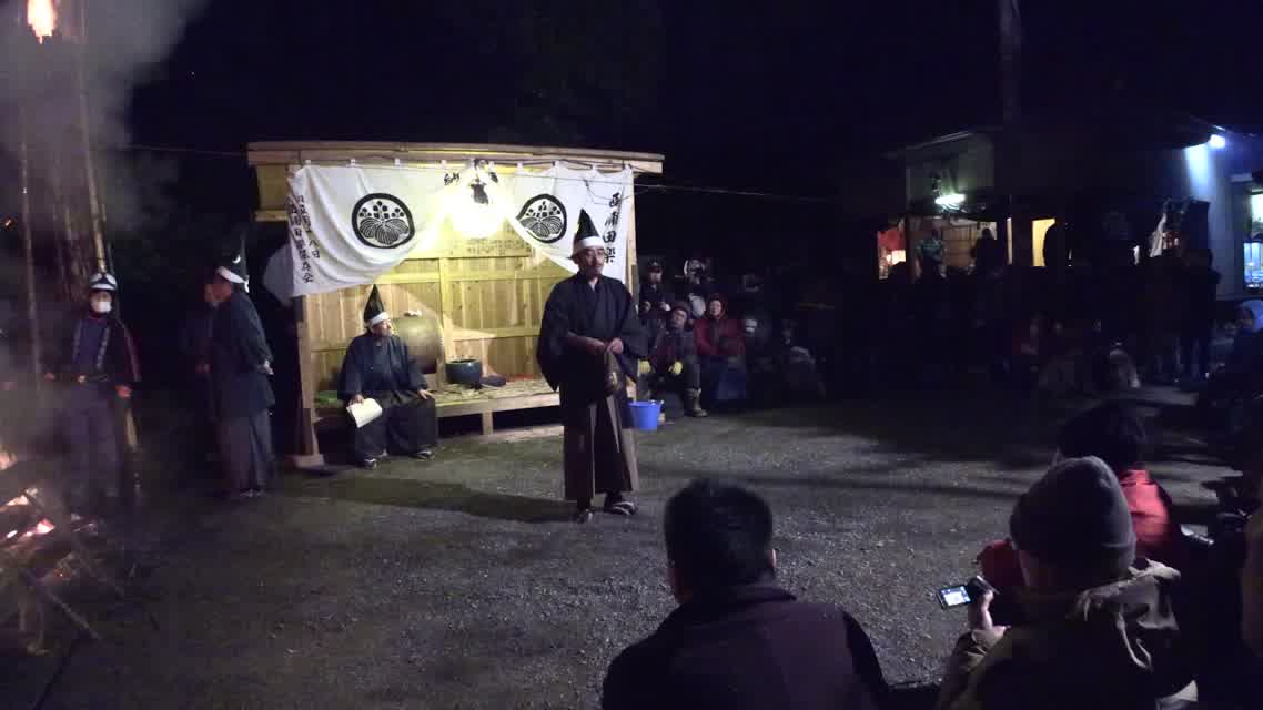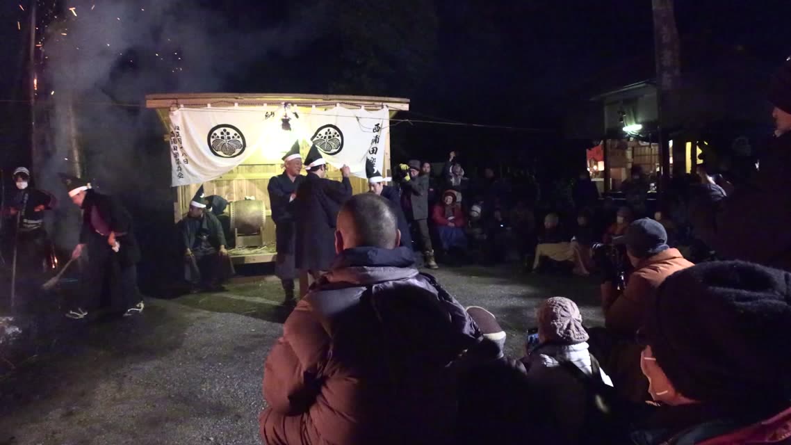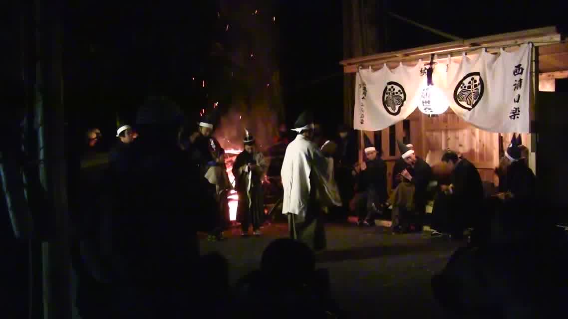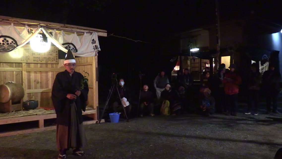 新年を寿いて豊作を願い、舞庭を清める演目。能衆全員が楽堂の前に集まり、神歌を唱和する。終わると、タヨガミによるタイハイがある。