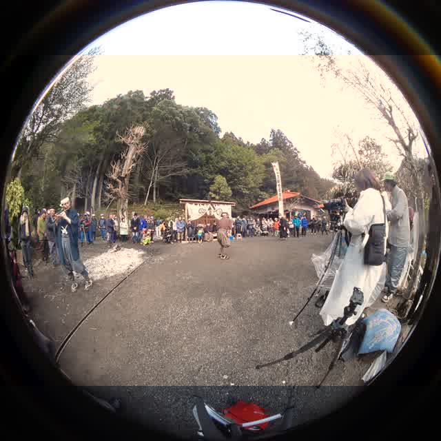 2人が高足の横木に足をかけて乗り、舞庭の地面を踏み固める。