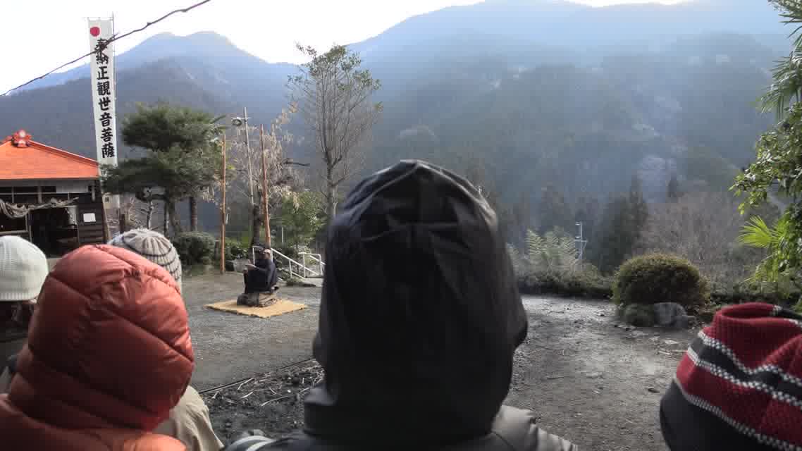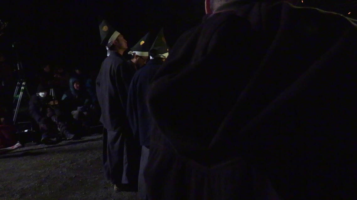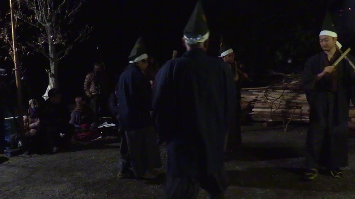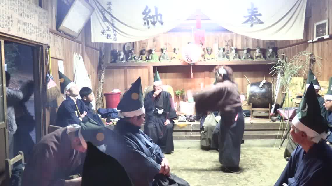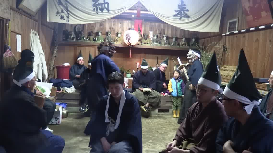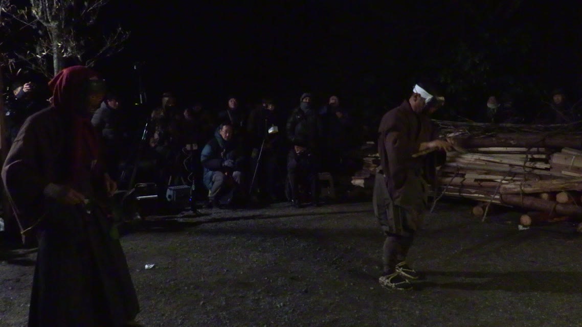 仏の舞に先だって、六観音様の通り道を祓い、その庭を作る。つづいて能衆、さらに願衆が加わって祈願をなす。
