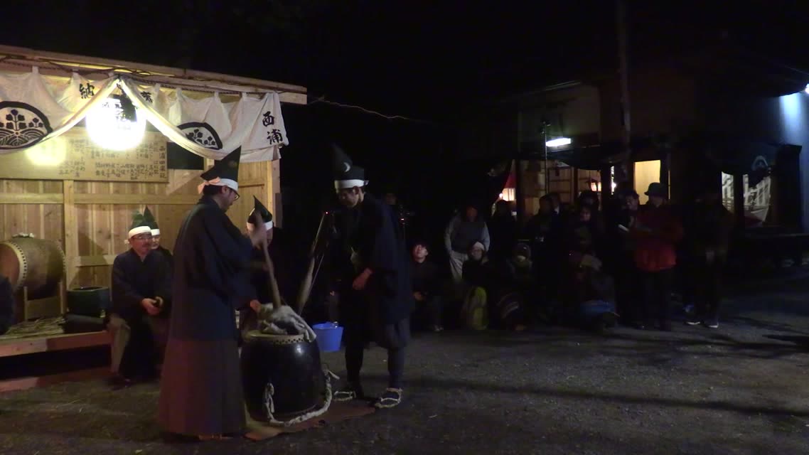 太鼓に座した禰宜役の上衣や烏帽子、幣束を、散米盗人が奪う所作をくり返し、田の水口で水を出し入れするさまを表す。