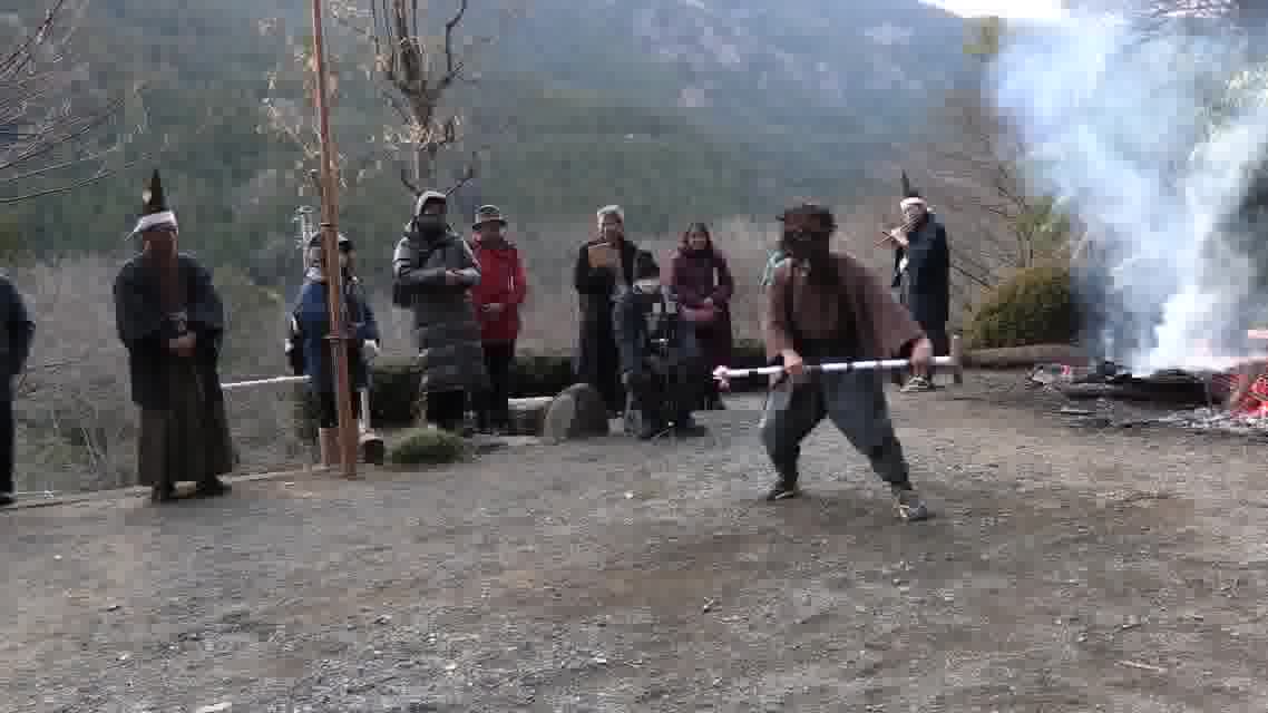 舞庭の地中に潜む悪霊を祓う舞。長槍を持って7周してから「へんばい」を踏む。